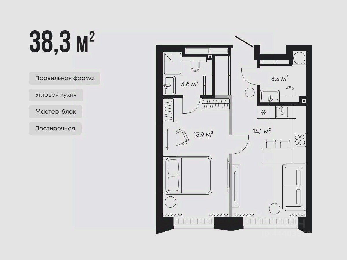 Планировка предусматривает мастер-спальню со сквозной гардеробной, кухню-гостиную с угловым гарнитуром и дополнительный санузел.