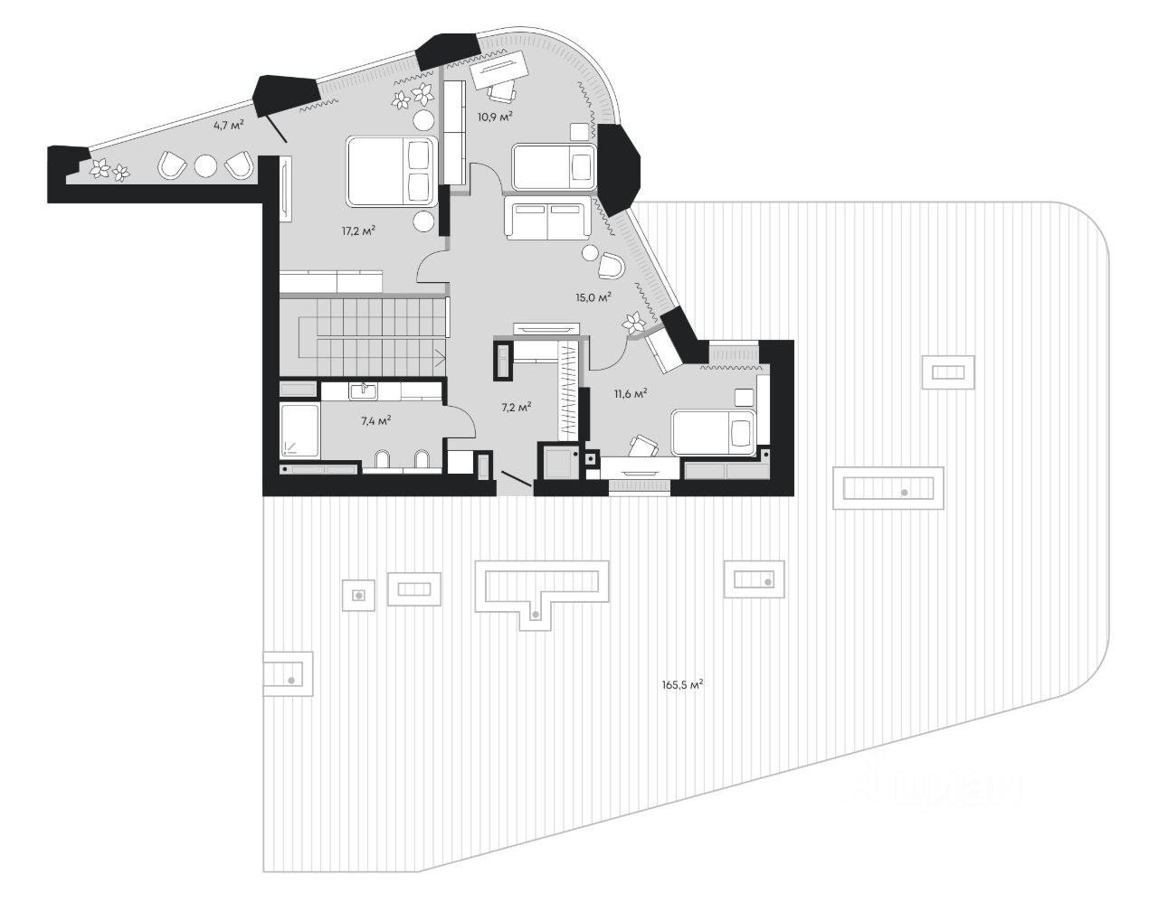 Второй уровень — приватный. Здесь располагаются три спальни и комната отдыха с выходом на лоджию.