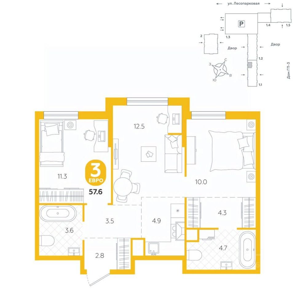 Квартира располагается в ГК ''Чистые Пруды'' от ''Паритет девелопмент''. Это флагманский проект компании в Тюмени. Расположение вдали от шумных улиц и оживленного центра создает ощущение жизни на природе и окружает тишиной и спокойствием. Есть вся необходимая социальная и коммерческая инфраструктура: магазины и сфера услуг на первых этажах. Школы, сады, поликлиника, парки в шаговой доступности. Квартал строится в районе Новой Лесобазы. Рядом выезд на объездную, что существенно экономит время. Поездка до центра города на автомобиле занимает 15-20 минут. Городские кварталы ''Чистые Пруды'' сформирован из домов переменной этажности и многоуровневых паркингов. Ввод 1 очереди строительства запланирован на II кв. 2028 года. Всё благоустройство квартала представлено двумя функциональными зонами: приватная внутри дворовая и общественная. Каждый закрытый двор имеет выход на единую променадную зону - бульвар. Концепция благоустройства основана на принципе модульности, что формирует основную идею приватности. Приватность проекта подчеркивает его особенный климат внутри. Модульное благоустройство позволит максимально эффективно использовать пространство двора и удовлетворить потребности различных категорий жителей. В квартирах базово выполнена улучшенная черновая отделка, которая включает в себя: выровненные стены, стяжка пола с шумоизоляцией, горизонтальная разводка отопления, установлены счетчики с телеметрией, окна с 5-камерным профилем и надежные входные двери. При желании можно добавить ремонт от застройщика и включить его в стоимость ипотеки, что позволит сэкономить на стройматериалах и переехать сразу после получения ключей. Характеристики квартиры: этаж - 2 количество комнат - 3 номер помещения - 13 площадь квартиры - 57,6 кв.мГармоничные пропорции и большие окна наполняют пространство светом, создавая уютную атмосферу. Умное зонирование позволяет удобно организовать как рабочую, так и жилую зоны, что особенно важно для современных жителей. Санузел спроектирован с учетом всех потребностей: здесь есть ванна и место для стиральной машины. Каждый метр квартиры используется с максимальной эффективностью, что делает эту планировку отличным выбором для тех, кто ценит комфорт и удобство.