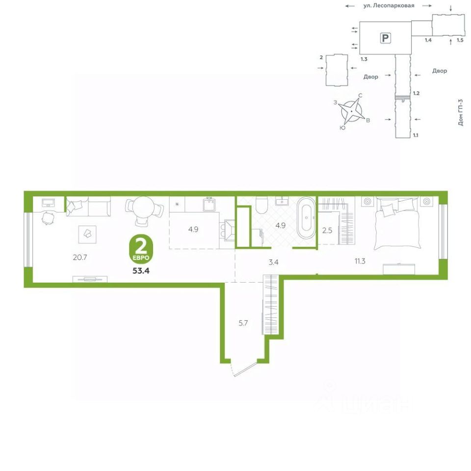Квартира располагается в ГК ''Чистые Пруды'' от ''Паритет девелопмент''. Это флагманский проект компании в Тюмени. Расположение вдали от шумных улиц и оживленного центра создает ощущение жизни на природе и окружает тишиной и спокойствием. Есть вся необходимая социальная и коммерческая инфраструктура: магазины и сфера услуг на первых этажах. Школы, сады, поликлиника, парки в шаговой доступности. Квартал строится в районе Новой Лесобазы. Рядом выезд на объездную, что существенно экономит время. Поездка до центра города на автомобиле занимает 15-20 минут. Городские кварталы ''Чистые Пруды'' сформирован из домов переменной этажности и многоуровневых паркингов. Ввод 1 очереди строительства запланирован на II кв. 2028 года. Всё благоустройство квартала представлено двумя функциональными зонами: приватная внутри дворовая и общественная. Каждый закрытый двор имеет выход на единую променадную зону - бульвар. Концепция благоустройства основана на принципе модульности, что формирует основную идею приватности. Приватность проекта подчеркивает его особенный климат внутри. Модульное благоустройство позволит максимально эффективно использовать пространство двора и удовлетворить потребности различных категорий жителей. В квартирах базово выполнена улучшенная черновая отделка, которая включает в себя: выровненные стены, стяжка пола с шумоизоляцией, горизонтальная разводка отопления, установлены счетчики с телеметрией, окна с 5-камерным профилем и надежные входные двери. При желании можно добавить ремонт от застройщика и включить его в стоимость ипотеки, что позволит сэкономить на стройматериалах и переехать сразу после получения ключей. Характеристики квартиры: этаж - 10 количество комнат - 2 номер помещения - 102 площадь квартиры - 53,4 кв.мГармоничные пропорции и большие окна наполняют пространство светом, создавая уютную атмосферу. Умное зонирование позволяет удобно организовать как рабочую, так и жилую зоны, что особенно важно для современных жителей. Санузел спроектирован с учетом всех потребностей: здесь есть ванна и место для стиральной машины. Каждый метр квартиры используется с максимальной эффективностью, что делает эту планировку отличным выбором для тех, кто ценит комфорт и удобство.