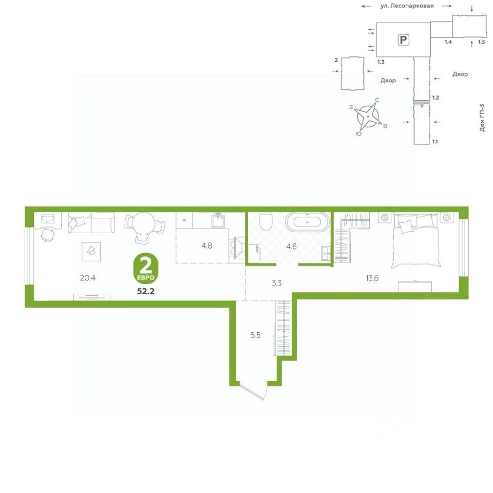Квартира располагается в ГК ''Чистые Пруды'' от ''Паритет девелопмент''. Это флагманский проект компании в Тюмени. Расположение вдали от шумных улиц и оживленного центра создает ощущение жизни на природе и окружает тишиной и спокойствием. Есть вся необходимая социальная и коммерческая инфраструктура: магазины и сфера услуг на первых этажах. Школы, сады, поликлиника, парки в шаговой доступности. Квартал строится в районе Новой Лесобазы. Рядом выезд на объездную, что существенно экономит время. Поездка до центра города на автомобиле занимает 15-20 минут. Городские кварталы ''Чистые Пруды'' сформирован из домов переменной этажности и многоуровневых паркингов. Ввод 1 очереди строительства запланирован на II кв. 2028 года. Всё благоустройство квартала представлено двумя функциональными зонами: приватная внутри дворовая и общественная. Каждый закрытый двор имеет выход на единую променадную зону - бульвар. Концепция благоустройства основана на принципе модульности, что формирует основную идею приватности. Приватность проекта подчеркивает его особенный климат внутри. Модульное благоустройство позволит максимально эффективно использовать пространство двора и удовлетворить потребности различных категорий жителей. В квартирах базово выполнена улучшенная черновая отделка, которая включает в себя: выровненные стены, стяжка пола с шумоизоляцией, горизонтальная разводка отопления, установлены счетчики с телеметрией, окна с 5-камерным профилем и надежные входные двери. При желании можно добавить ремонт от застройщика и включить его в стоимость ипотеки, что позволит сэкономить на стройматериалах и переехать сразу после получения ключей. Характеристики квартиры: этаж - 1 количество комнат - 2 номер помещения - 3 площадь квартиры - 52,2 кв.мГармоничные пропорции и большие окна наполняют пространство светом, создавая уютную атмосферу. Умное зонирование позволяет удобно организовать как рабочую, так и жилую зоны, что особенно важно для современных жителей. Санузел спроектирован с учетом всех потребностей: здесь есть ванна и место для стиральной машины. Каждый метр квартиры используется с максимальной эффективностью, что делает эту планировку отличным выбором для тех, кто ценит комфорт и удобство.