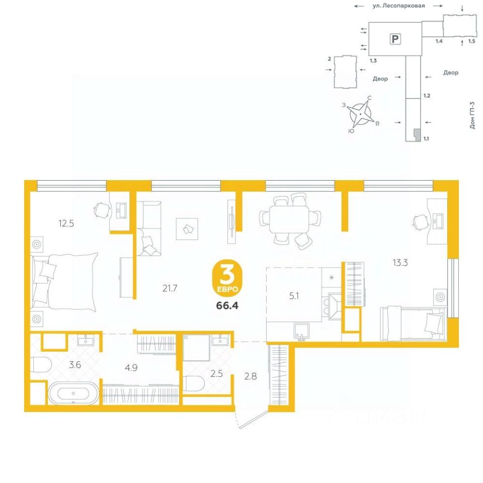 Квартира располагается в ГК ''Чистые Пруды'' от ''Паритет девелопмент''. Это флагманский проект компании в Тюмени. Расположение вдали от шумных улиц и оживленного центра создает ощущение жизни на природе и окружает тишиной и спокойствием. Есть вся необходимая социальная и коммерческая инфраструктура: магазины и сфера услуг на первых этажах. Школы, сады, поликлиника, парки в шаговой доступности. Квартал строится в районе Новой Лесобазы. Рядом выезд на объездную, что существенно экономит время. Поездка до центра города на автомобиле занимает 15-20 минут. Городские кварталы ''Чистые Пруды'' сформирован из домов переменной этажности и многоуровневых паркингов. Ввод 1 очереди строительства запланирован на II кв. 2028 года. Всё благоустройство квартала представлено двумя функциональными зонами: приватная внутри дворовая и общественная. Каждый закрытый двор имеет выход на единую променадную зону - бульвар. Концепция благоустройства основана на принципе модульности, что формирует основную идею приватности. Приватность проекта подчеркивает его особенный климат внутри. Модульное благоустройство позволит максимально эффективно использовать пространство двора и удовлетворить потребности различных категорий жителей. В квартирах базово выполнена улучшенная черновая отделка, которая включает в себя: выровненные стены, стяжка пола с шумоизоляцией, горизонтальная разводка отопления, установлены счетчики с телеметрией, окна с 5-камерным профилем и надежные входные двери. При желании можно добавить ремонт от застройщика и включить его в стоимость ипотеки, что позволит сэкономить на стройматериалах и переехать сразу после получения ключей. Характеристики квартиры: этаж - 13 количество комнат - 3 номер помещения - 128 площадь квартиры - 66,4 кв.мГармоничные пропорции и большие окна наполняют пространство светом, создавая уютную атмосферу. Умное зонирование позволяет удобно организовать как рабочую, так и жилую зоны, что особенно важно для современных жителей. Санузел спроектирован с учетом всех потребностей: здесь есть ванна и место для стиральной машины. Каждый метр квартиры используется с максимальной эффективностью, что делает эту планировку отличным выбором для тех, кто ценит комфорт и удобство.