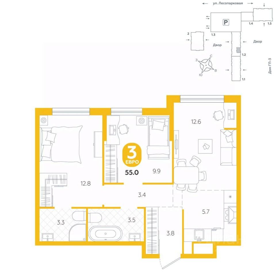 Квартира располагается в ГК ''Чистые Пруды'' от ''Паритет девелопмент''. Это флагманский проект компании в Тюмени. Расположение вдали от шумных улиц и оживленного центра создает ощущение жизни на природе и окружает тишиной и спокойствием. Есть вся необходимая социальная и коммерческая инфраструктура: магазины и сфера услуг на первых этажах. Школы, сады, поликлиника, парки в шаговой доступности. Квартал строится в районе Новой Лесобазы. Рядом выезд на объездную, что существенно экономит время. Поездка до центра города на автомобиле занимает 15-20 минут. Городские кварталы ''Чистые Пруды'' сформирован из домов переменной этажности и многоуровневых паркингов. Ввод 1 очереди строительства запланирован на II кв. 2028 года. Всё благоустройство квартала представлено двумя функциональными зонами: приватная внутри дворовая и общественная. Каждый закрытый двор имеет выход на единую променадную зону - бульвар. Концепция благоустройства основана на принципе модульности, что формирует основную идею приватности. Приватность проекта подчеркивает его особенный климат внутри. Модульное благоустройство позволит максимально эффективно использовать пространство двора и удовлетворить потребности различных категорий жителей. В квартирах базово выполнена улучшенная черновая отделка, которая включает в себя: выровненные стены, стяжка пола с шумоизоляцией, горизонтальная разводка отопления, установлены счетчики с телеметрией, окна с 5-камерным профилем и надежные входные двери. При желании можно добавить ремонт от застройщика и включить его в стоимость ипотеки, что позволит сэкономить на стройматериалах и переехать сразу после получения ключей. Характеристики квартиры: этаж - 11 количество комнат - 3 номер помещения - 238 площадь квартиры - 55 кв.мГармоничные пропорции и большие окна наполняют пространство светом, создавая уютную атмосферу. Умное зонирование позволяет удобно организовать как рабочую, так и жилую зоны, что особенно важно для современных жителей. Санузел спроектирован с учетом всех потребностей: здесь есть ванна и место для стиральной машины. Каждый метр квартиры используется с максимальной эффективностью, что делает эту планировку отличным выбором для тех, кто ценит комфорт и удобство.