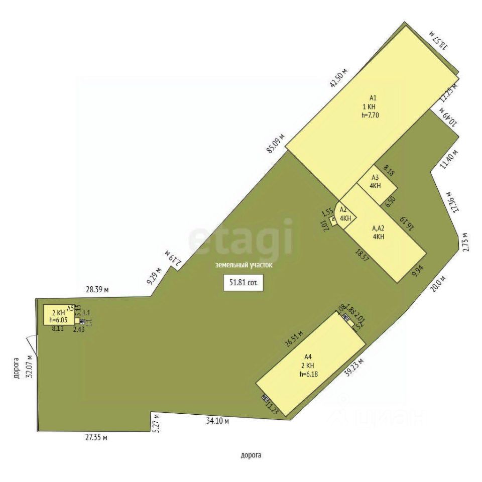 • Площадь территории: 5 181 м² • Объекты на территории: • 5-этажное офисное здание (АБК) — 1 943 м² • 2-этажное здание (склад) — 470 м² • Производственный цех — 750 м² • Проходная — 52 м² • Здание магазина и автомойка • Новое здание небольшого цеха, предназначенное для слесарных работ