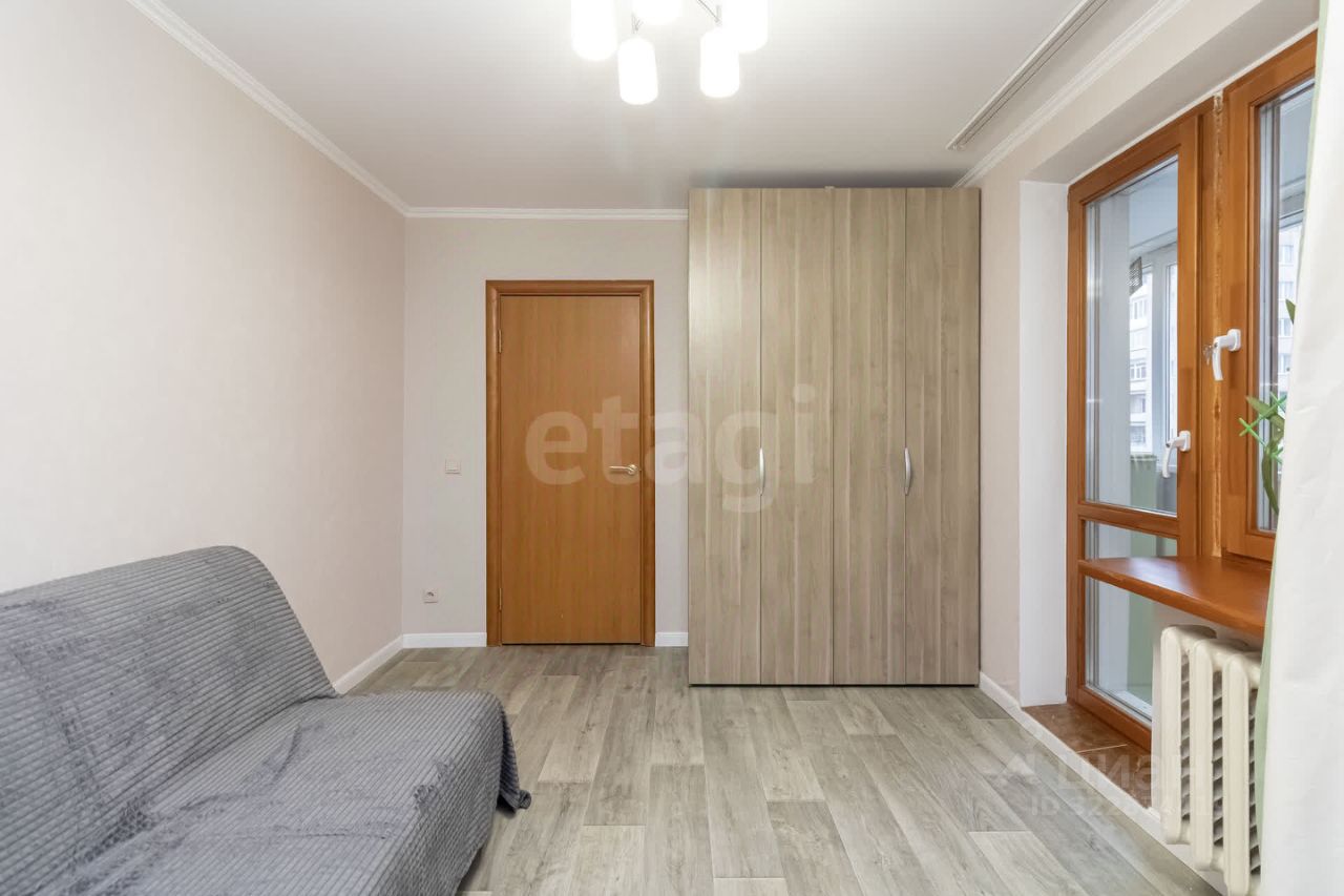 Комната с балконом (13,2 м²). Два больших окна выходят на улицу Елецкую и во двор. В комнате расположено место для хранения (шкаф), стоит просторный диван, и есть место для рабочей зоны. Балкон застекленный, утепленный, с местом для хранения.