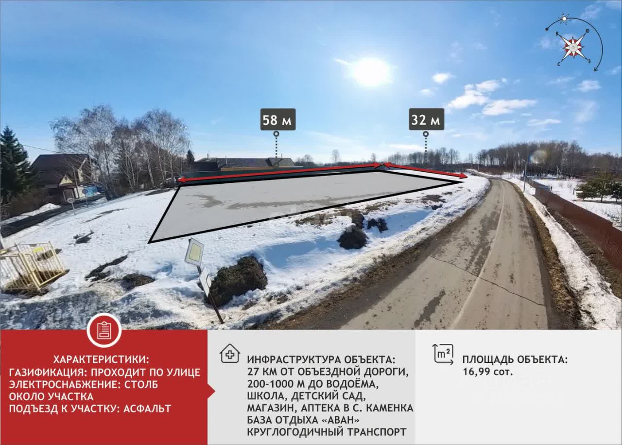 Расположение участка в центре деревни, асфальтированные подъездные пути, газ и электричество рядом с участком. Замечательная природа, вид на реку будет радовать Вас в любое время года.