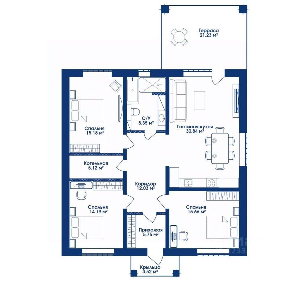 В доме расположилась просторная кухня-гостиная с выходом на большую террасу, 3 спальни, санузел с окном и котельная.