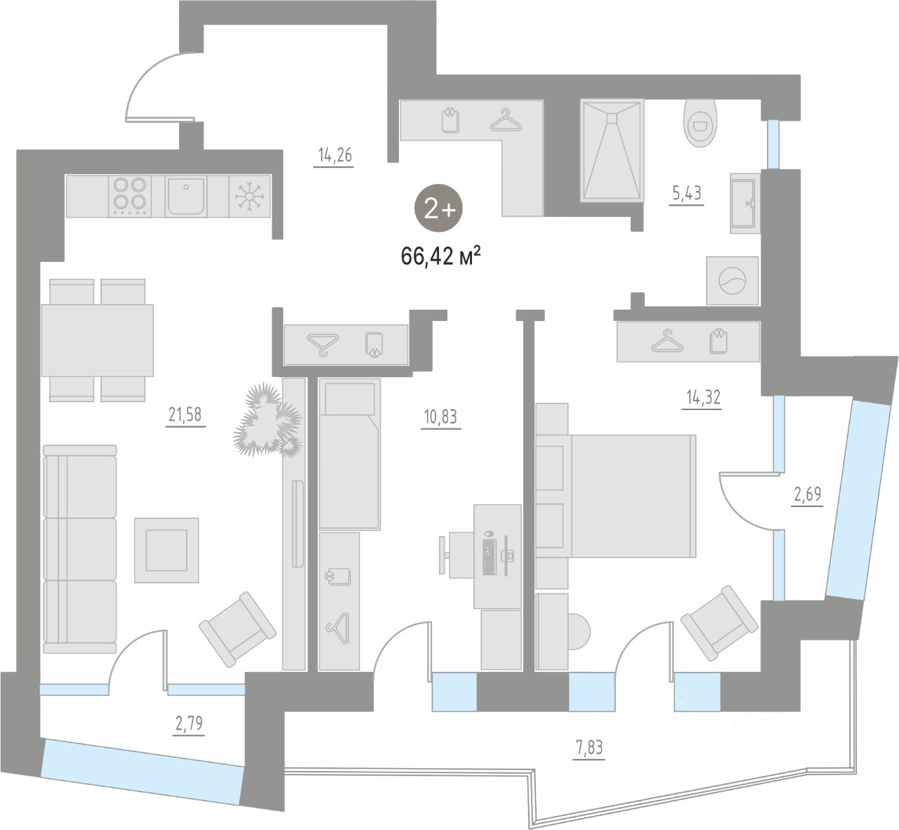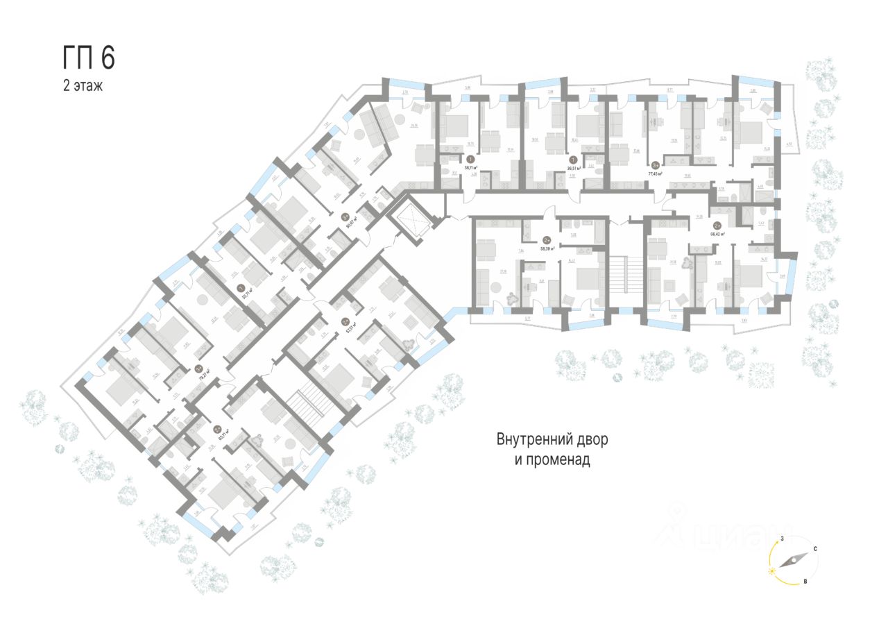 В квартирах: панорамные окна высотой от 2,4 м.