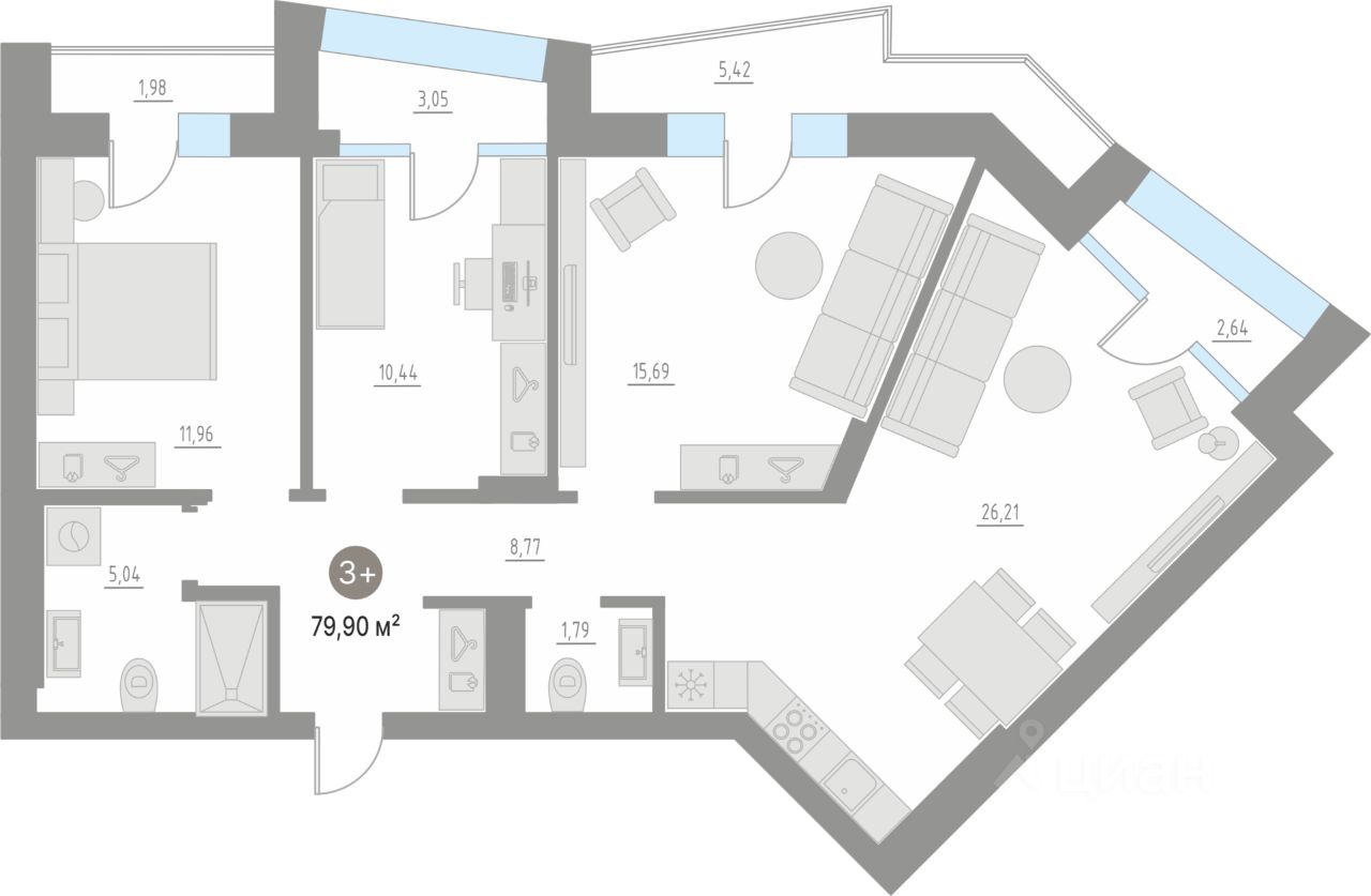 В квартирах: панорамные окна высотой от 2,4 м.