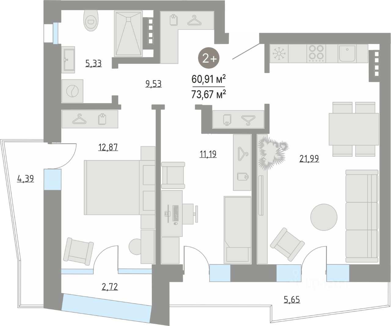 В квартирах: панорамные окна высотой от 2,4 м.