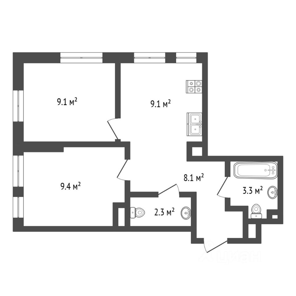 Две изолированные комнаты ( 9.1 и 9.4 м²) — идеально для семьи с детьми или тех, кто хочет обустроить спальню, детскую и рабочий кабинет.