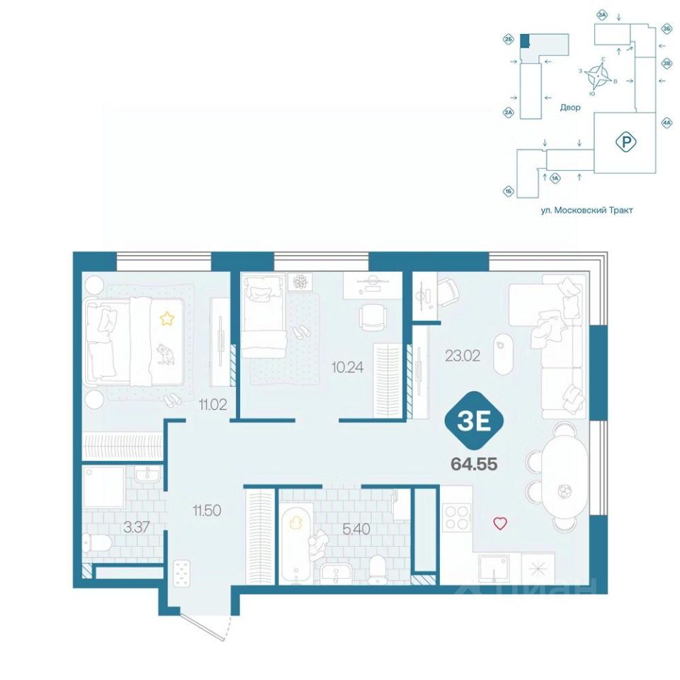 Просторная трешка с окнами на две стороны. В квартире просторная прихожая с нищами под вместительные шкафы для хранения. Две светлых спальни. Гостиная площадью более 20 м² с угловым остеклением, нишей для приготовления, обеденной и гостиной зонами, а также нишей для рабочего места.