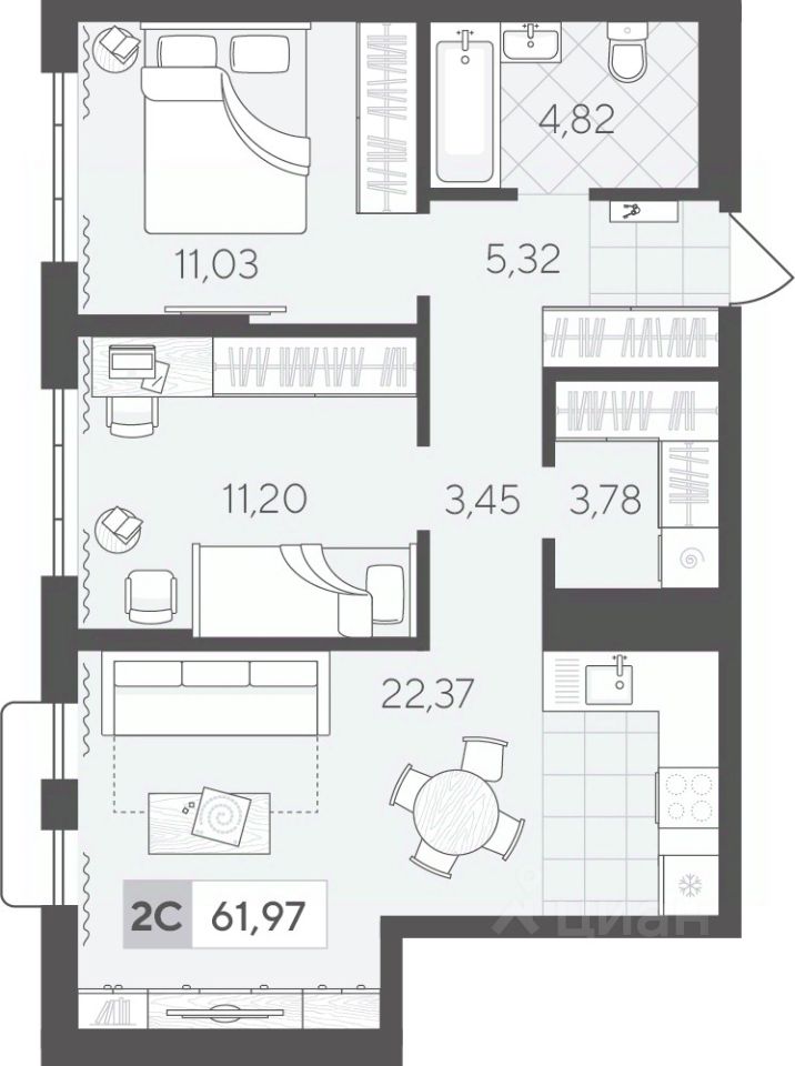 Двухкомнатная квартира 61.97 кв.м на 5 этаже — это удобное пространство для комфортной жизни. Отдельные спальни позволят каждому члену семьи иметь личное пространство. В кухне-гостиной комфортно вместе готовить, проводить семейные ужины или настольные игры с друзьями.