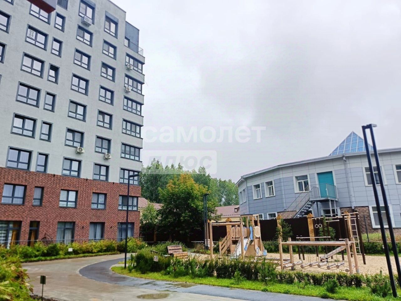 Детская площадка прямо во дворе. Закрытая парковка для автомобилей.