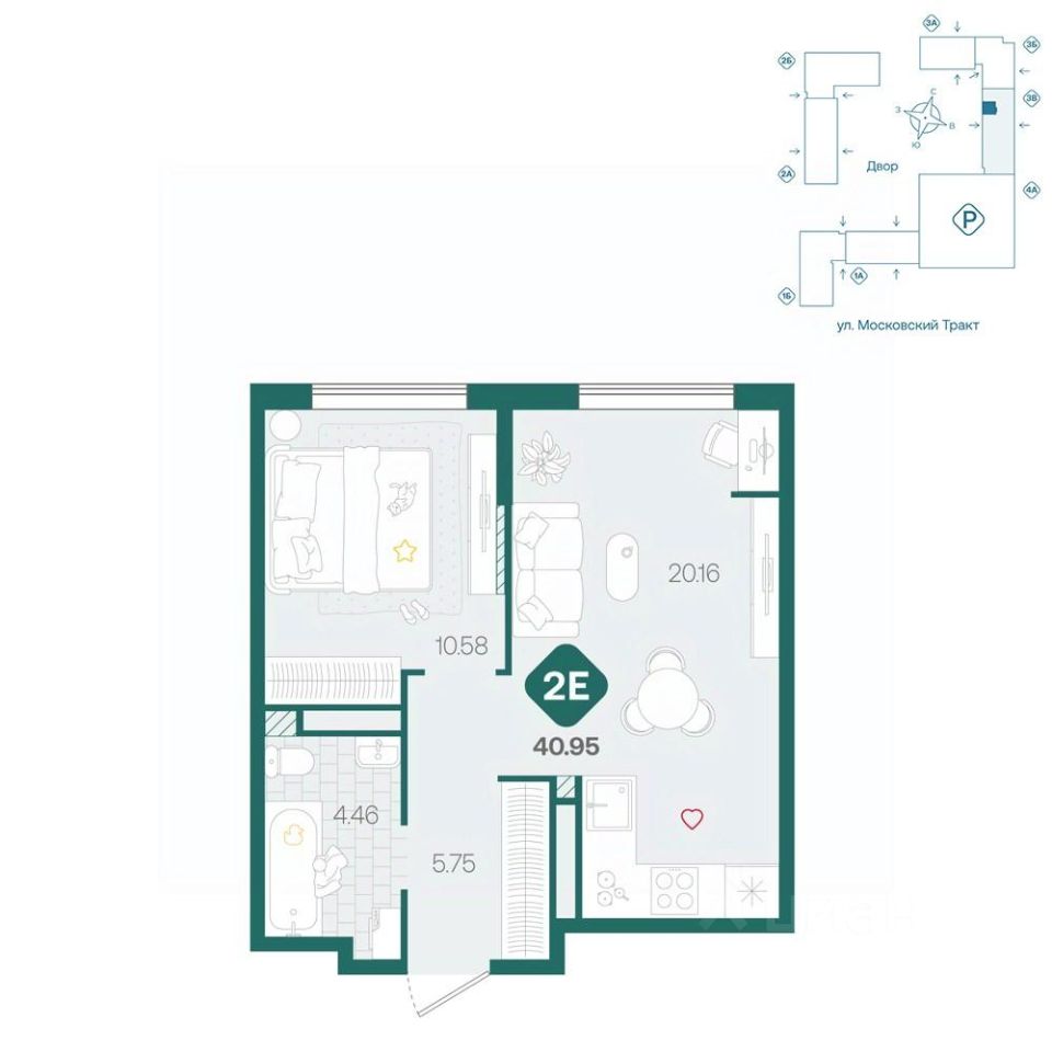 Двухкомнатная квартира с большой кухней более 20м² с удобным зонированием на четыре зоны: для приготовления, обеда, отдыха и работы. В отдельной спальне и прихожей предусмотрены ниши для хранения одежды. В санузле достаточно места для стиральнйо и сушильной машин.