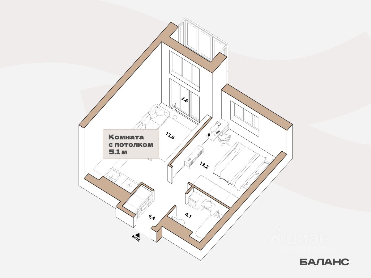 Планировка-хайфлэт с потолками 5,1 метров и отдельной спальней. В просторной кухне-гостиной выход на панорамную лоджию — окна рядом с ней в пол. Для хранения вещей в прихожей подготовлена ниша под шкаф-купе.