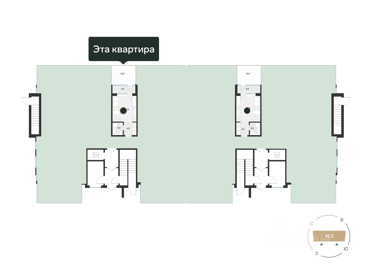 Студия с лоджией. Она с панорамным остеклением в пол. Там же выход в урбан-сад: летом можете поставить снаружи садовую мебель и выходить в урбан-сад, чтобы почитать книгу. Зимой — выпить горячий шоколад в пледе на свежем воздухе. Кухню можете разместить в нише и отгородить спальное место перегородками.