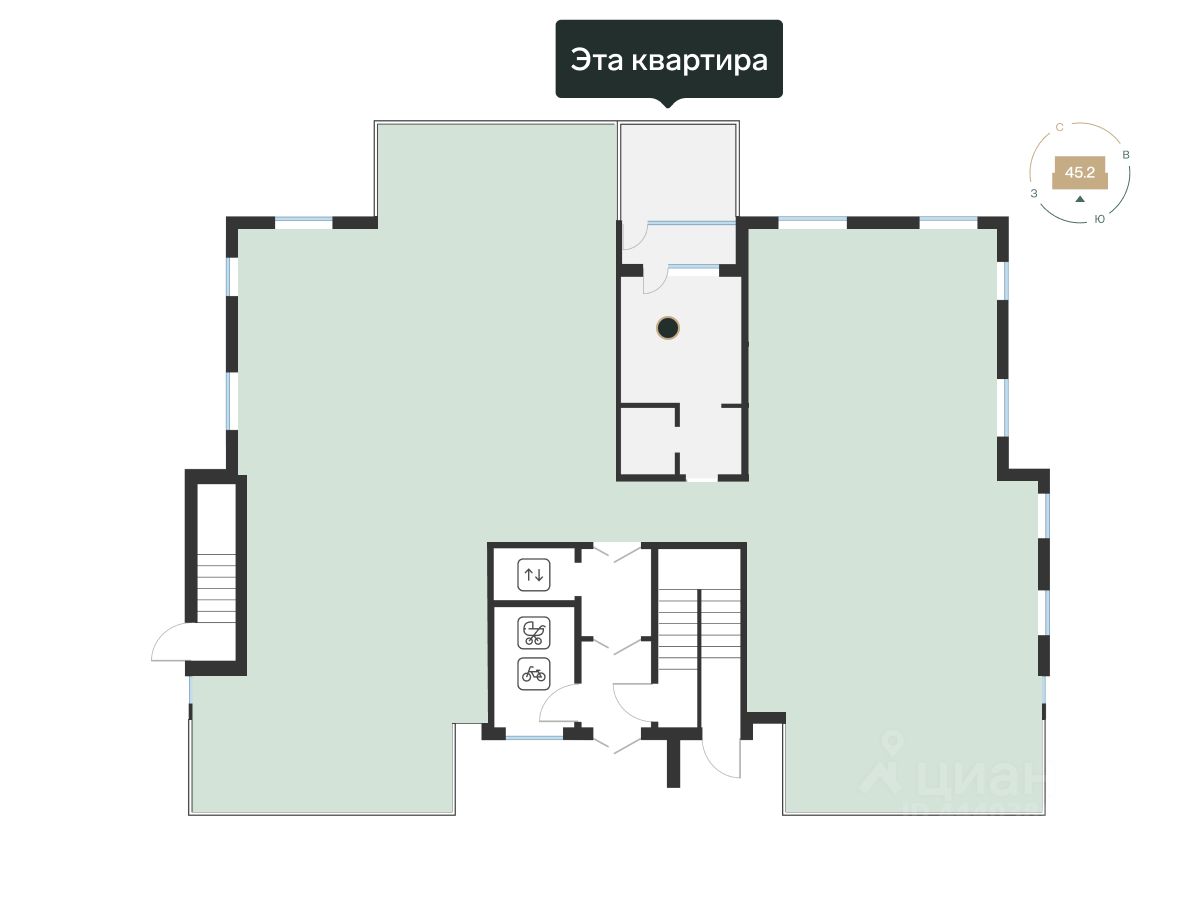Студия с лоджией. Она с панорамным остеклением в пол. Там же выход в урбан-сад: летом можете поставить снаружи садовую мебель и выходить в урбан-сад, чтобы почитать книгу. Зимой — выпить горячий шоколад в пледе на свежем воздухе. Кухню можете разместить в нише и отгородить спальное место перегородками.
