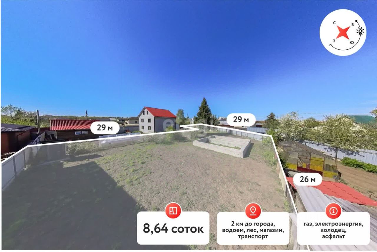 Участок высокий вдали от шумной трассы. Газ проходит по улице, электрический столб возле участка, хорошие асфальтированные подъездные пути. Участок огорожен забором из профнастила. Имеется фундамент 8*9м и кирпичный гараж. Также получено разрешение на строительство частного дома, можете сразу начинать строить!