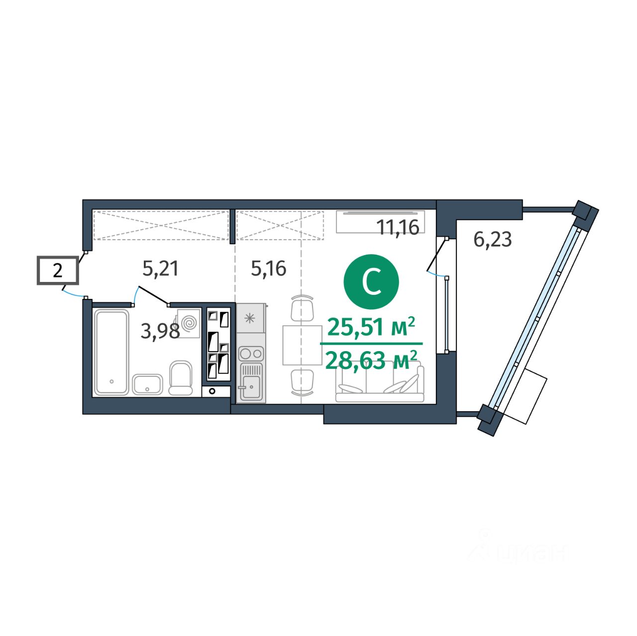 Общая площадь25,51 м2