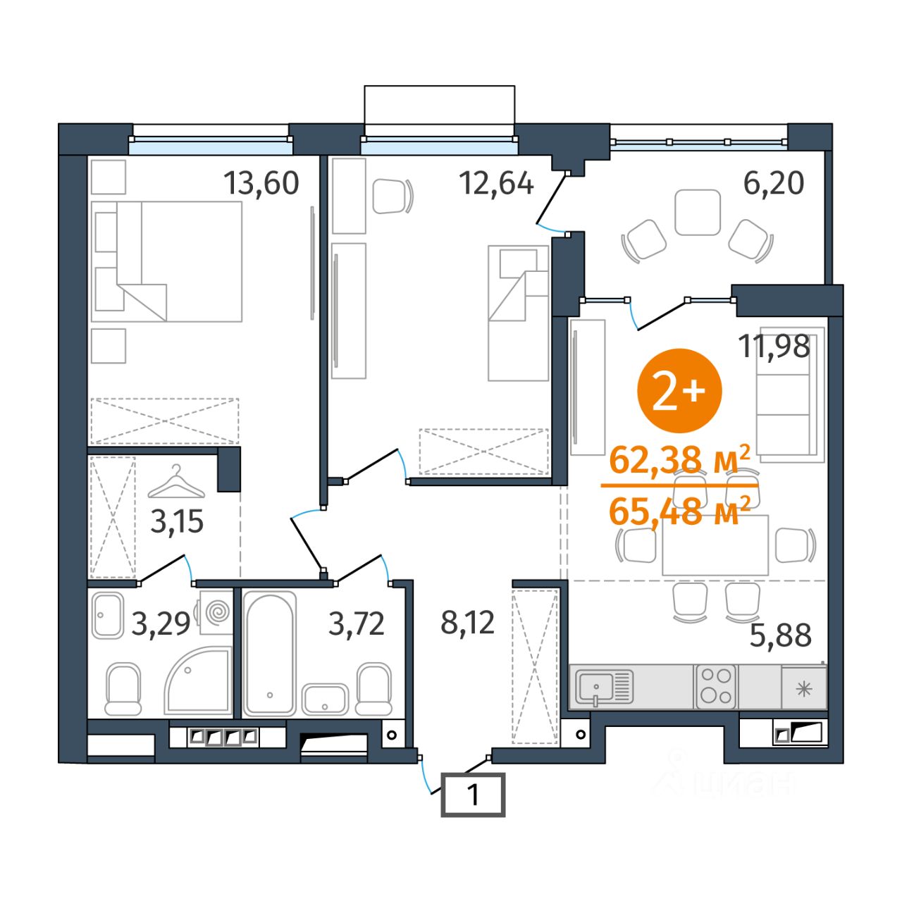 Общая площадь62,38 м2