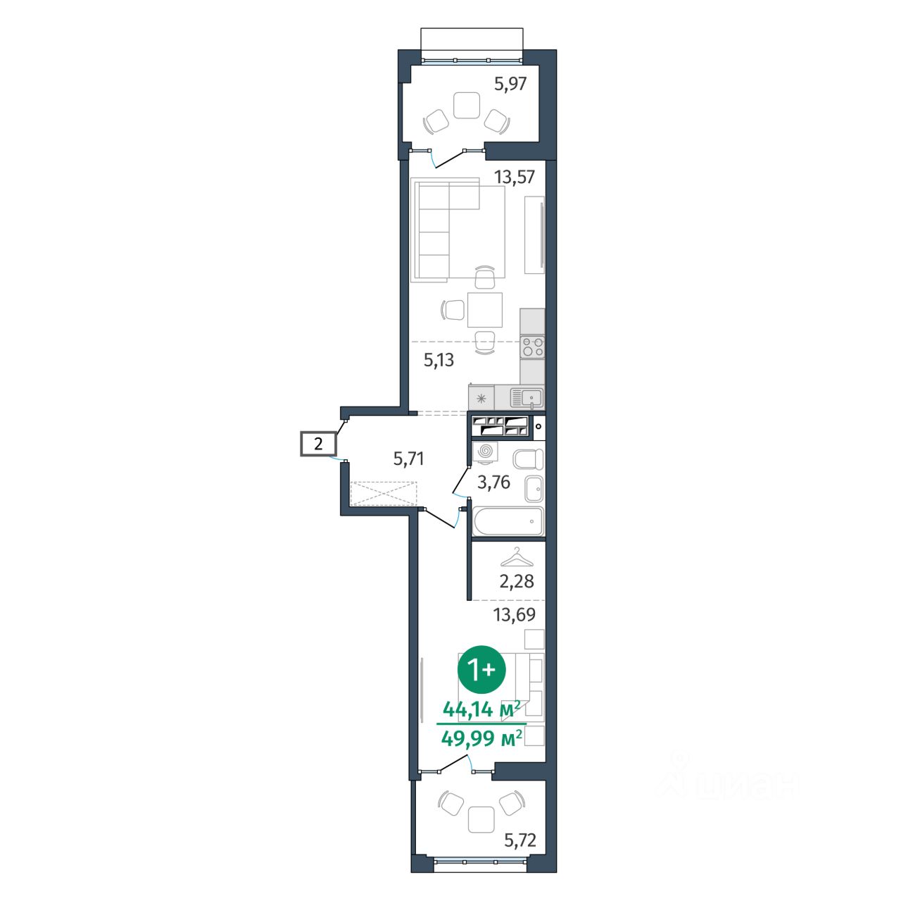 Общая площадь44,14 м2