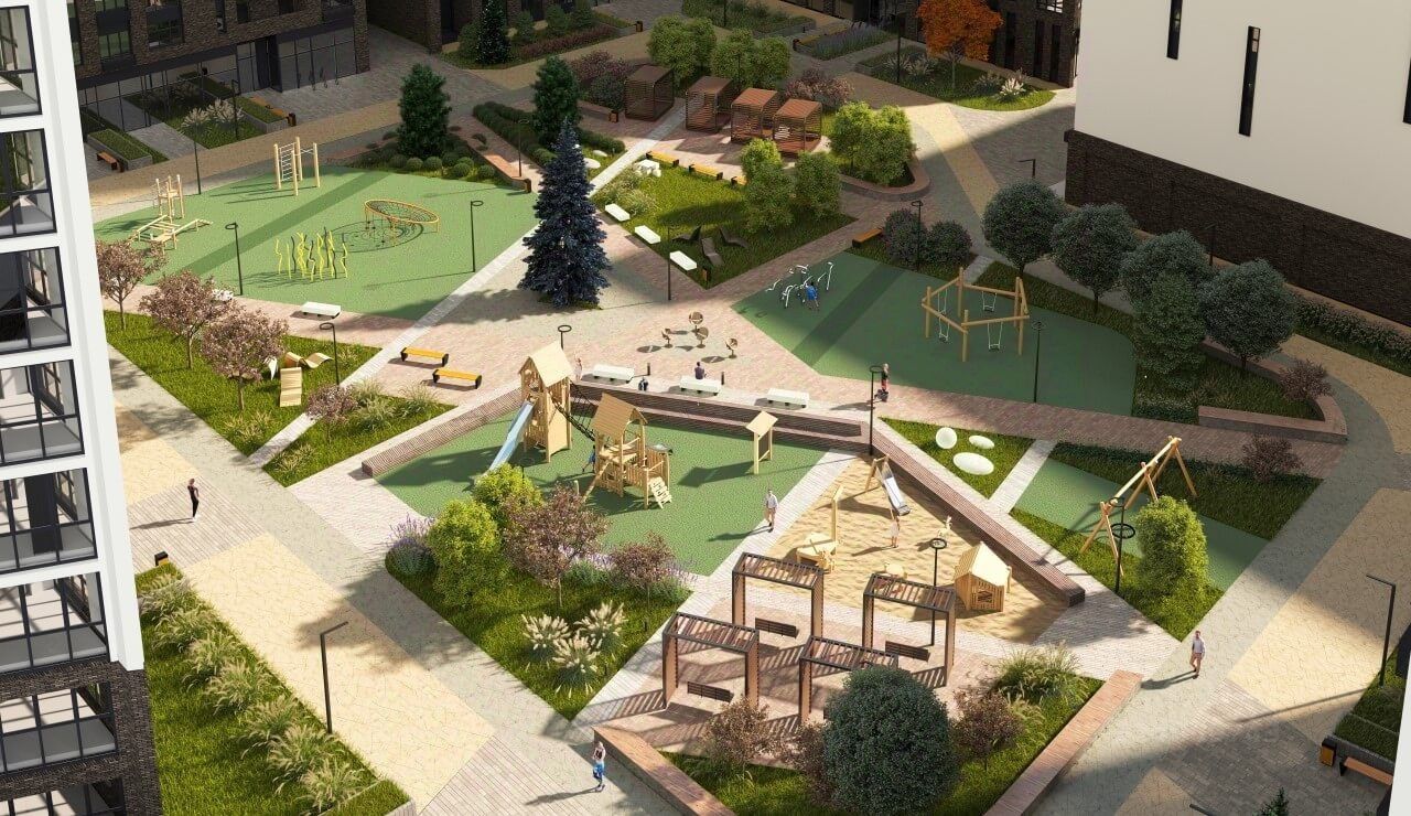 Дворовое пространство Организовано по принципу безбарьерной среды, свободной от машин. Все площадки для шумных командных игр также вынесены за пределы двора. Игровые зоны спланированы так, чтобы удобно было и детям, и родителям. Качели, песочницы и разнообразные спортивные зоны хорошо просматриваются, но расположены на достаточном расстоянии, и юные жители в разгар игр не помешают взрослым. В центре двора в первом квартале мы обустроим мини-площадь с живой елью.