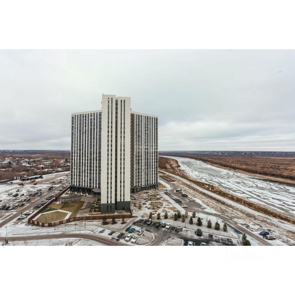Жилой комплекс на берегу Туры с живописным видом на реку, Мост влюбленных и исторический центр.