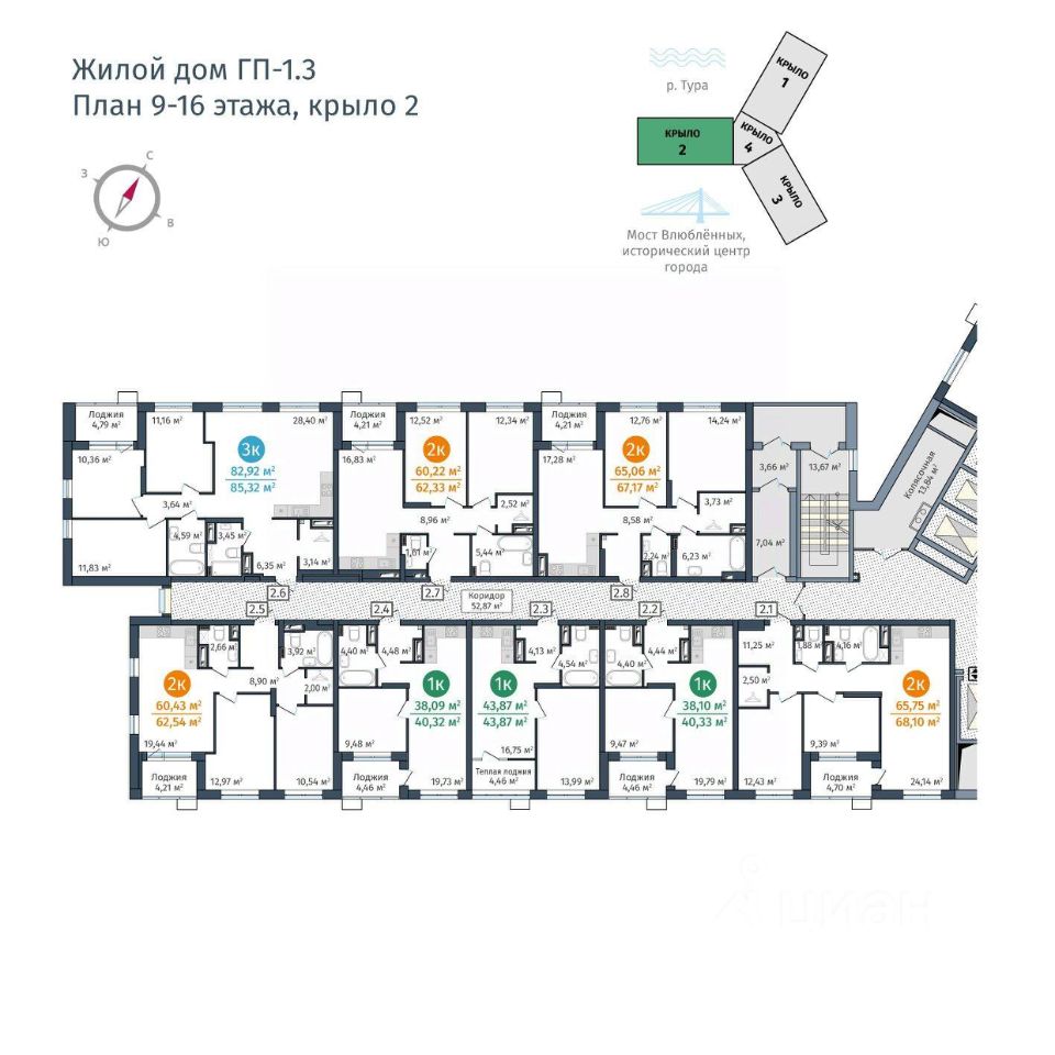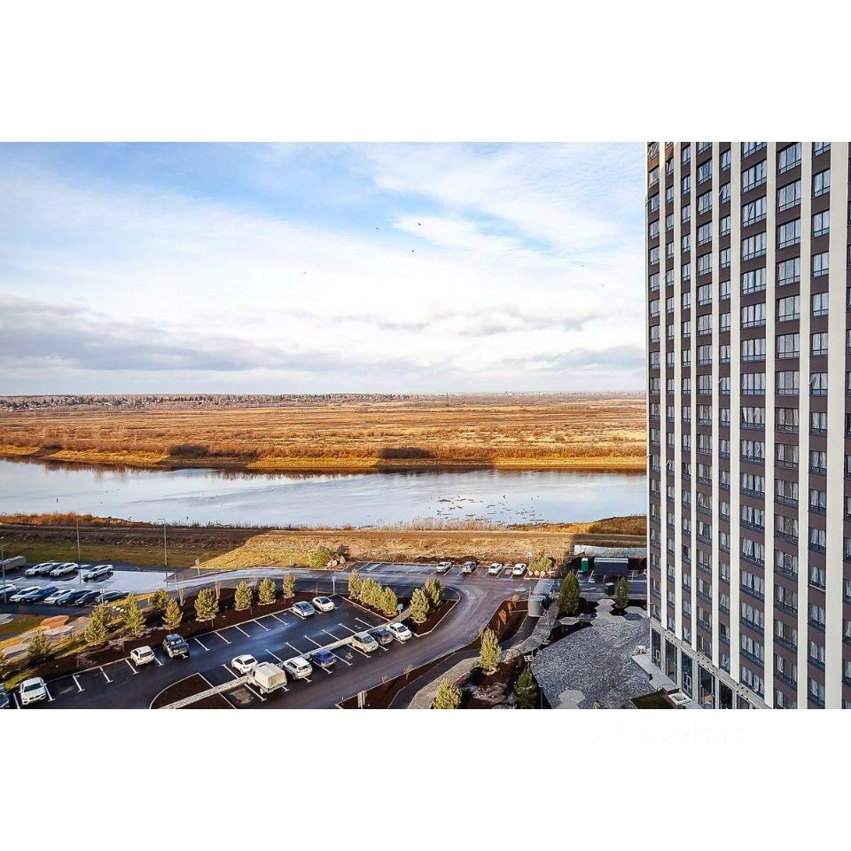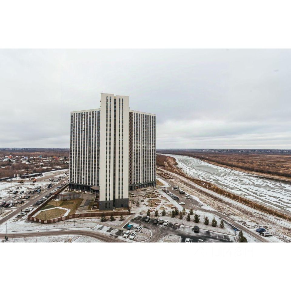 Жилой комплекс на берегу Туры с живописным видом на реку, Мост влюбленных и исторический центр.