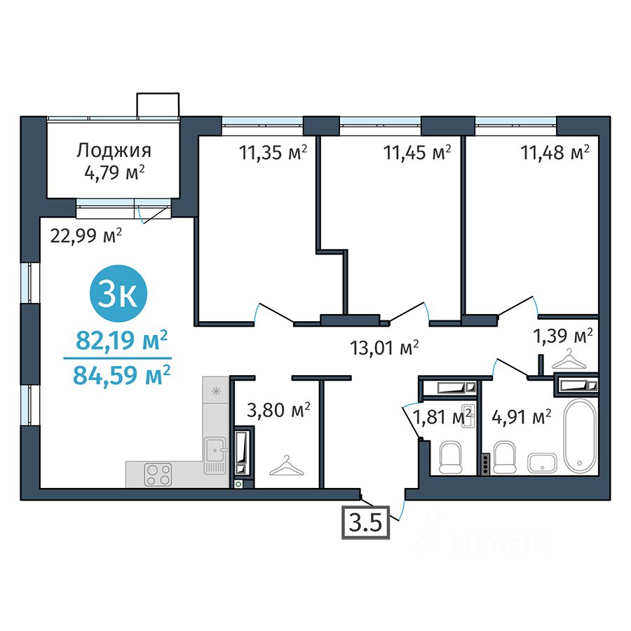 продам 3-к, Краснооктябрьская, 128 936 000 ₽