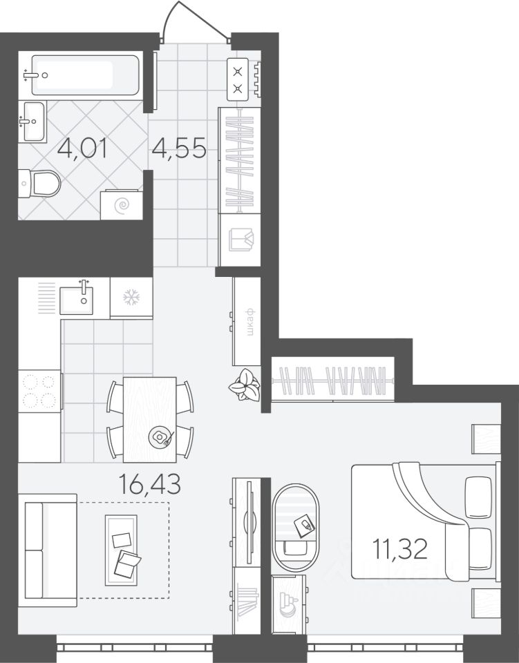 В квартире есть кухня-гостиная и отдельная спальня, предусмотрены ниши под шкафы-купе. Это позволяет оставить больше пространства для жизни.