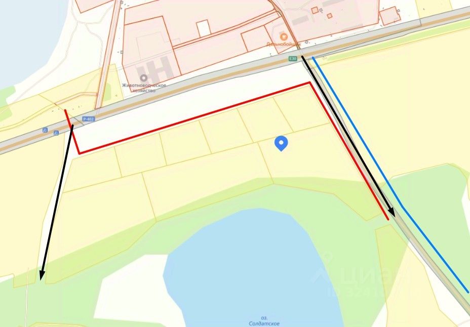 На фото 3 красным газопровод. синим ЛэП, черными стрелочками заезды.