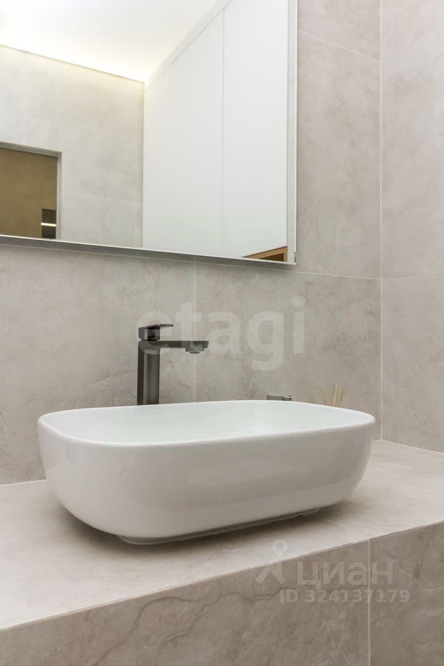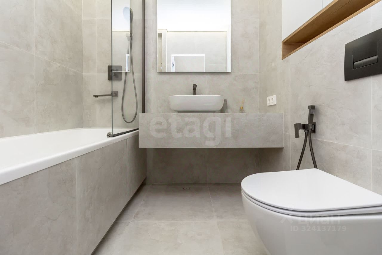 Совмещенный санузел с эксклюзивной отделкой и премиальной встраиваемой сантехникой.
