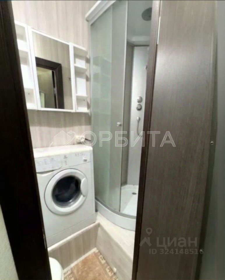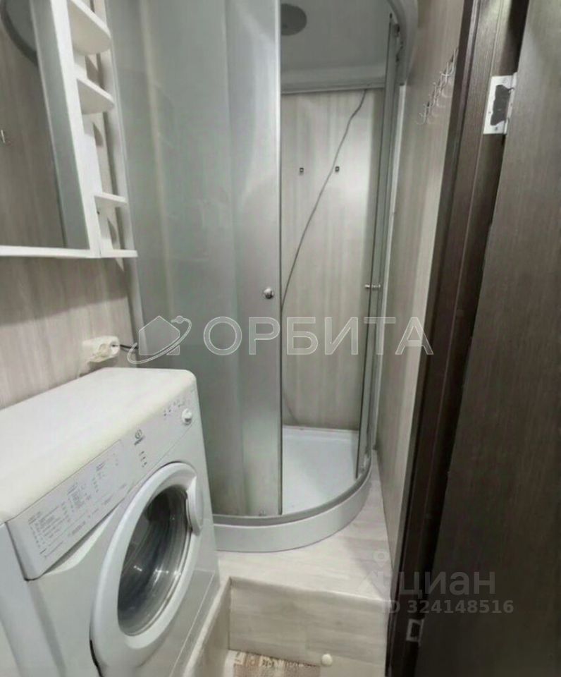 Душевая кабина, стиральная машинка и шкаф-пенал для хранения