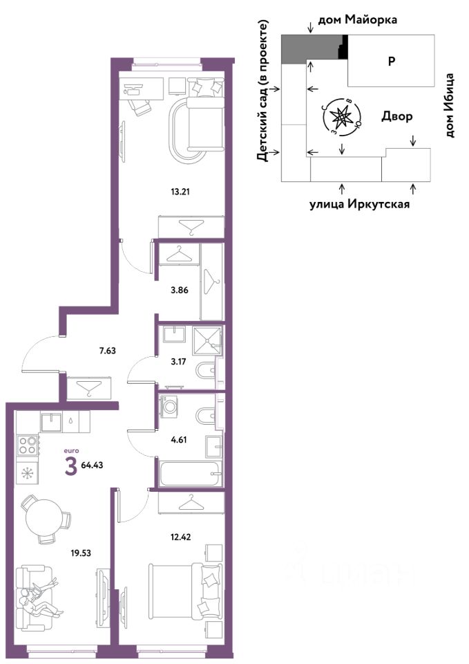 Продаётся 3-комнатная квартира в строящемся доме (Дом Тенерифе (ГП-2Я)), срок сдачи: IV-кв. 2027, общей площадью 64.43 кв.м., на 3 этаже. Новый жилой комплекс ''Остров-сад'' от Специализированного застройщика ''Страна. Коммунистическая'' расположен по адресу: г. Тюмень, по ул. Ярославская.