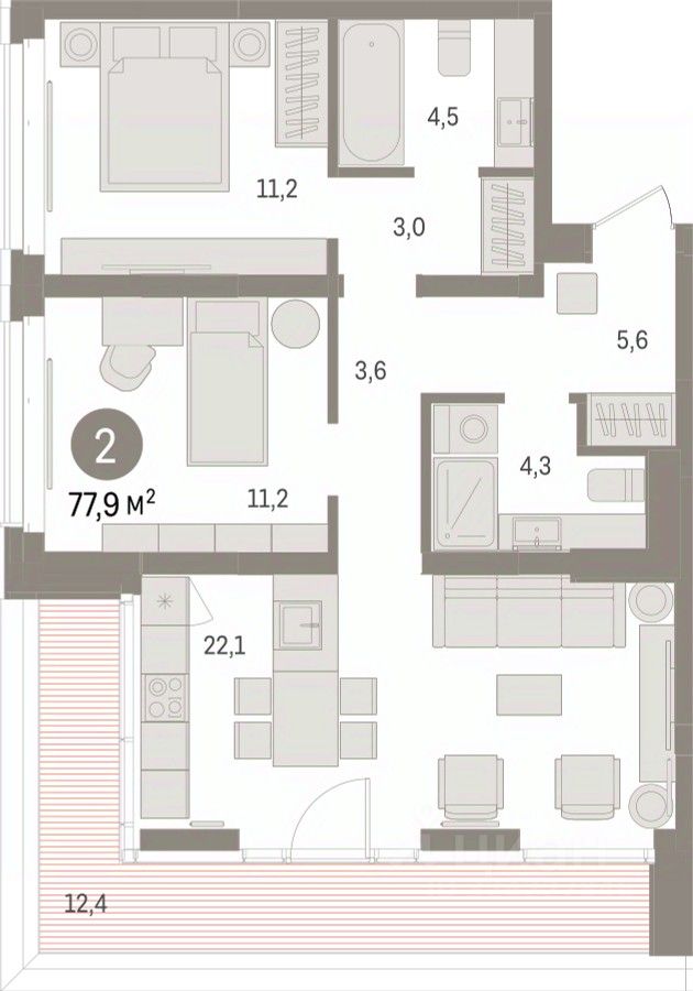 2-комн. квартира с предчистовой отделкой в Кварталы ''На Минской'' на 13 этаже. Общая площадь: 77.85 кв.м., жилая: 22.4 кв.м., площадь просторной кухни-гостиной: 22.1 кв.м. Угловая квартира, идеально подойдет любителям тишины и панорамных видов. В квартире один балкон, два совмещенных санузла. Терраса представляет собой роскошную зону отдыха, где вы на свой вкус можете создать атмосферу комфорта и уюта. Высота потолков 2.7 м.