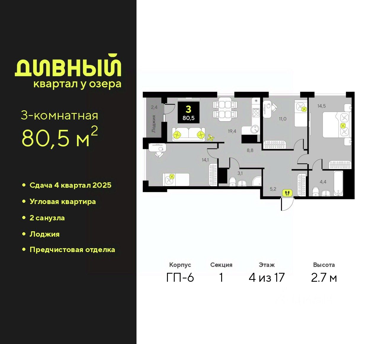Просторная 3-комн. квартира с предчистовой отделкой в ЖК ''Дивный квартал у озера'' на 4 этаже. Общая площадь: 80.5 кв.м., жилая: 39.6 кв.м., площадь просторной кухни-столовой: 19.4 кв.м. Квартира угловая, очень светлая, естественная вентиляция при открытии окон. В квартире одна лоджия, два совмещенных санузла. Высота потолков 2.7 м.