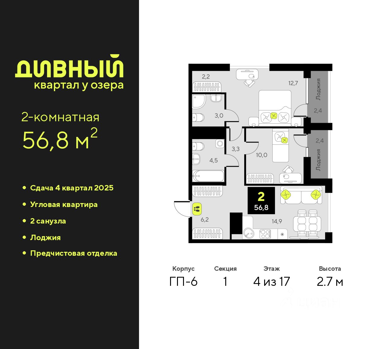 Продается двухкомнатная квартира с предчистовой отделкой в ЖК ''Дивный квартал у озера'' на 4 этаже. Общая площадь: 56.8 кв.м., жилая: 22.7 кв.м., площадь просторной кухни-столовой: 14.9 кв.м. Угловая квартира, идеально подойдет любителям тишины и панорамных видов. В квартире две лоджии, два совмещенных санузла. Высота потолков 2.7 м.