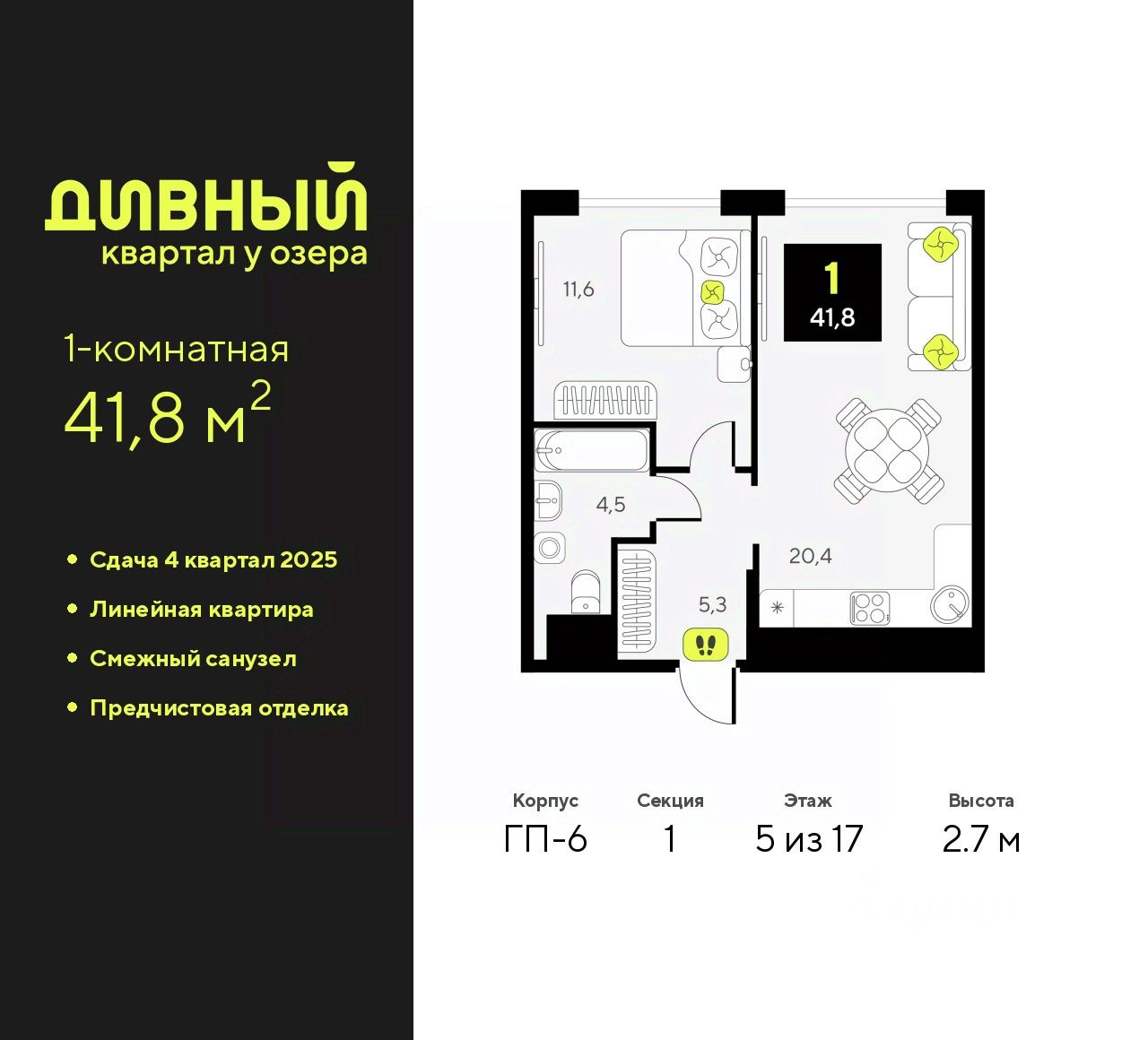 Продается 1-комн. квартира с предчистовой отделкой в ЖК ''Дивный квартал у озера'' на 5 этаже. Общая площадь: 41.8 кв.м., жилая: 11.6 кв.м., площадь просторной кухни-столовой: 20.4 кв.м. Все окна выходят на одну сторону. В квартире один совмещенный санузел. Высота потолков 2.7 м.
