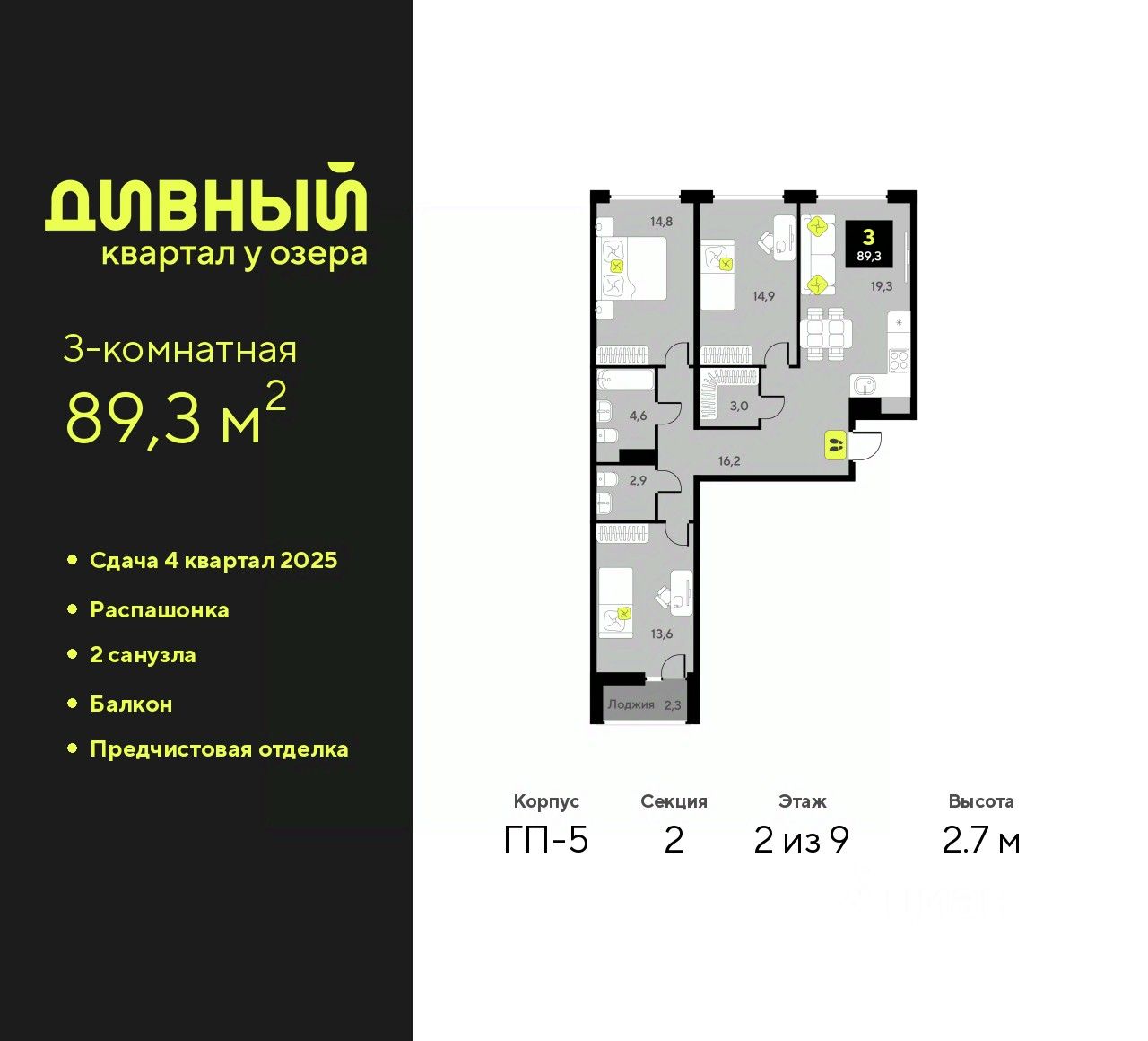 Просторная трехкомнатная квартира с предчистовой отделкой в ЖК ''Дивный квартал у озера'' на 2 этаже. Общая площадь: 89.3 кв.м., жилая: 43.1 кв.м., площадь просторной кухни-столовой: 19.3 кв.м. Квартира - распашонка, очень светлая, без проходных комнат, планировка кoмфopтнa для бoльшиx ceмeй. В квартире один балкон, один совмещенный и один раздельный санузел. Высота потолков 2.7 м.