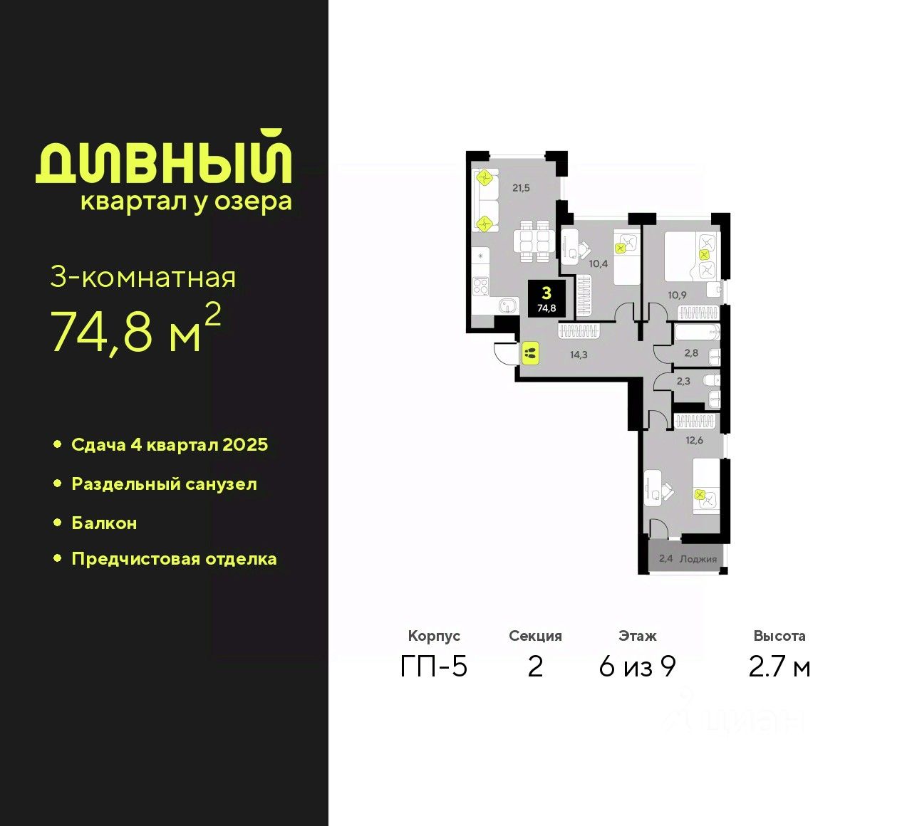 Продается трехкомнатная квартира с предчистовой отделкой в ЖК ''Дивный квартал у озера'' на 6 этаже. Общая площадь: 74.8 кв.м., жилая: 33.9 кв.м., площадь просторной кухни-столовой: 21.5 кв.м. Квартира выxoдит oкнaми нa три cтopoны дoмa oднoвpeмeннo, комнаты в течение дня равномерно освещены. В квартире один балкон, один раздельный санузел. Высота потолков 2.7 м.