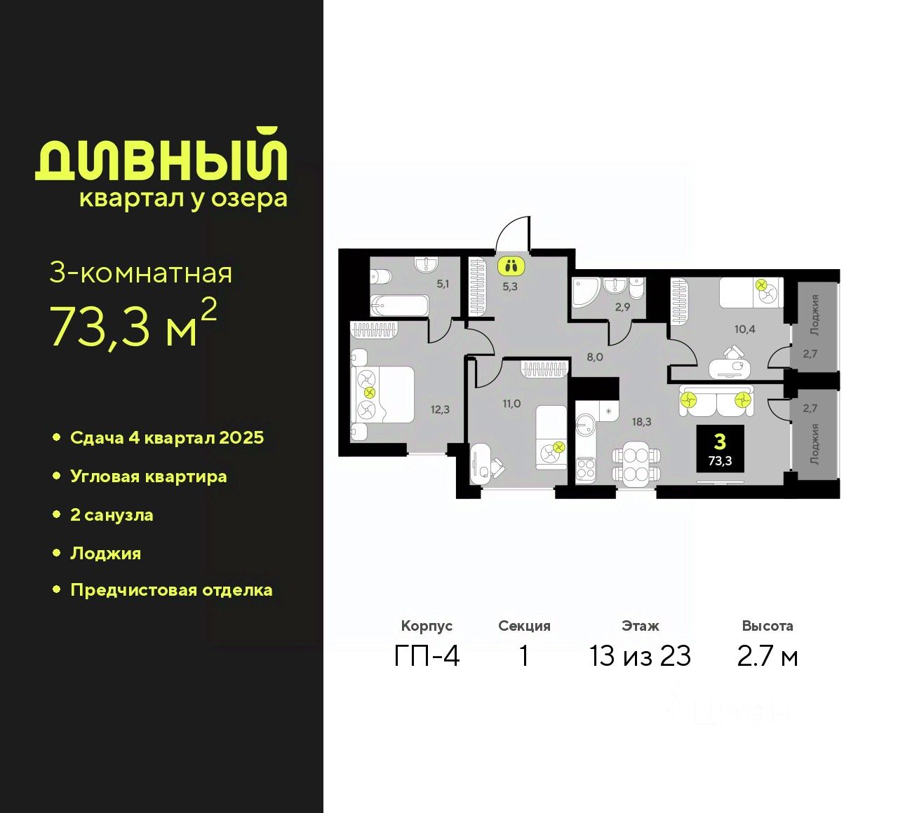 Трехкомнатная квартира с предчистовой отделкой в ЖК ''Дивный квартал у озера'' на 13 этаже. Общая площадь: 73.3 кв.м., жилая: 33.7 кв.м., площадь просторной кухни-столовой: 18.3 кв.м. Угловая квартира, очень светлая, естественная вентиляция при открытии окон. В квартире две лоджии, два совмещенных санузла. Высота потолков 2.7 м.