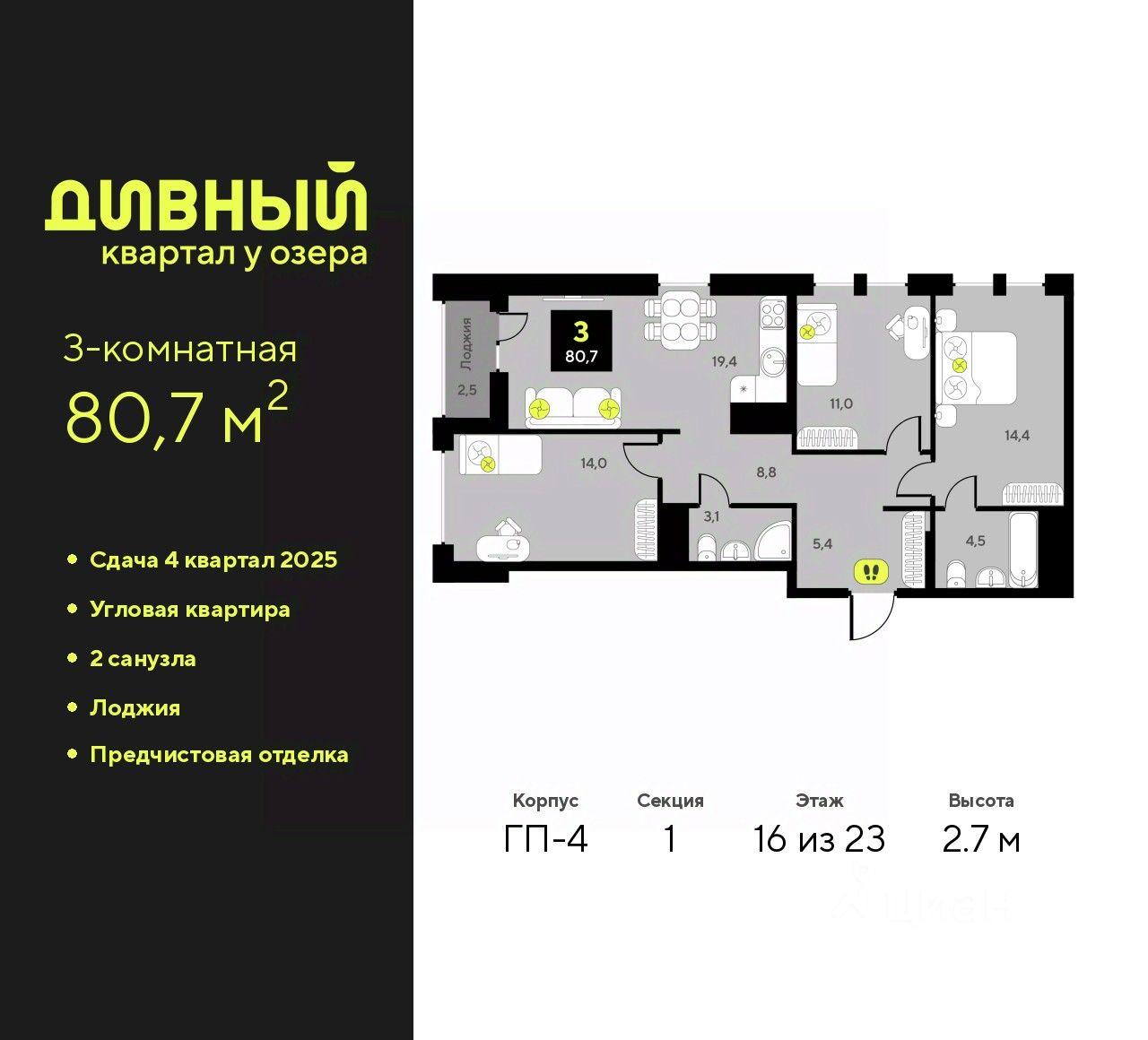 Трехкомнатная квартира с предчистовой отделкой в ЖК ''Дивный квартал у озера'' на 16 этаже. Общая площадь: 80.7 кв.м., жилая: 39.4 кв.м., площадь просторной кухни-столовой: 19.4 кв.м. Угловая квартира, идеально подойдет любителям тишины и панорамных видов. В квартире одна лоджия, два совмещенных санузла. Высота потолков 2.7 м.