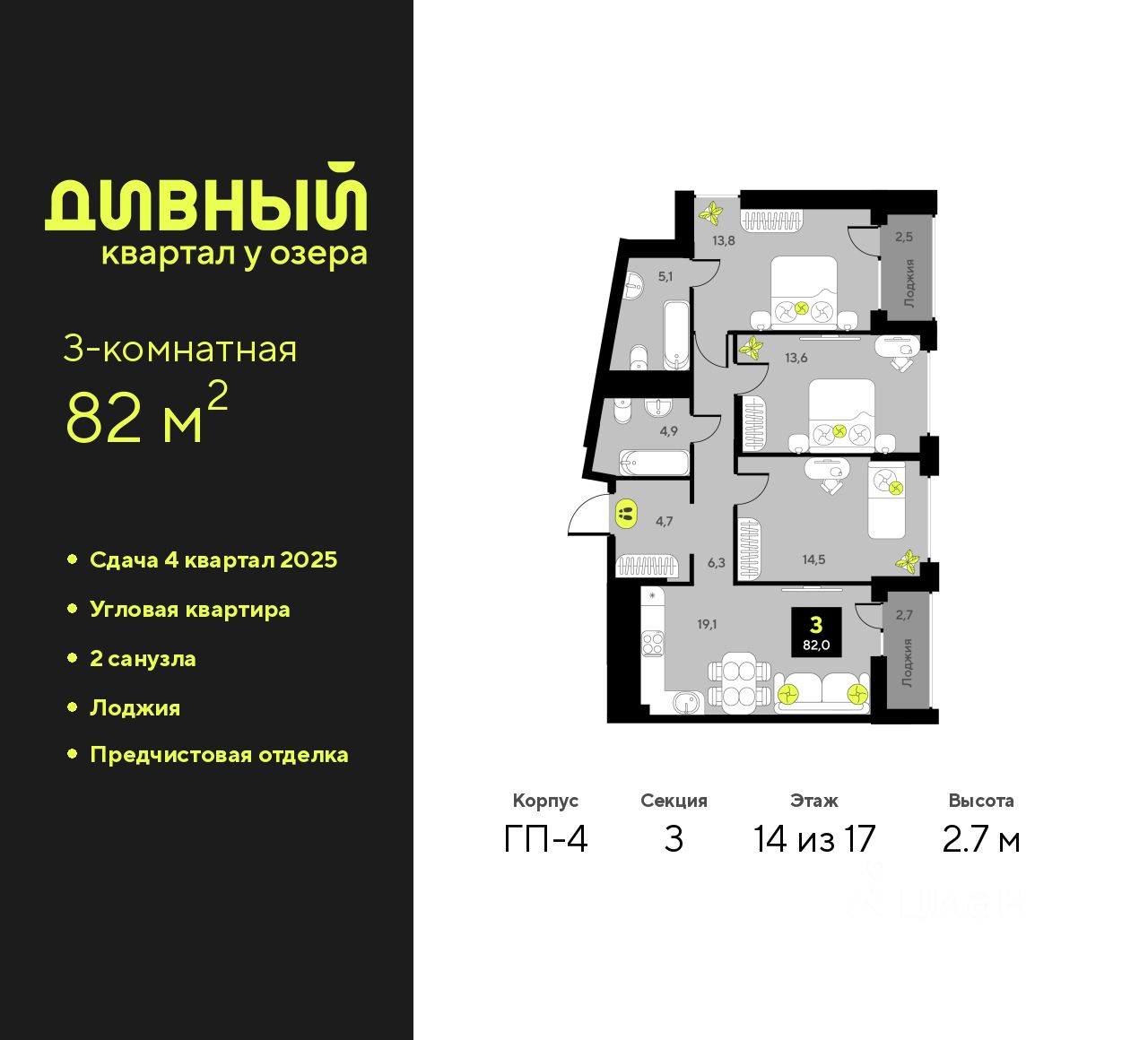Продается 3-комн. квартира с предчистовой отделкой в ЖК ''Дивный квартал у озера'' на 14 этаже. Общая площадь: 82 кв.м., жилая: 41.7 кв.м., площадь просторной кухни-столовой: 19.1 кв.м. Угловая квартира, окна oбecпeчивaют paвнoмepнoe ocвeщeниe в тeчeниe дня. В квартире две лоджии, два совмещенных санузла. Высота потолков 2.7 м.