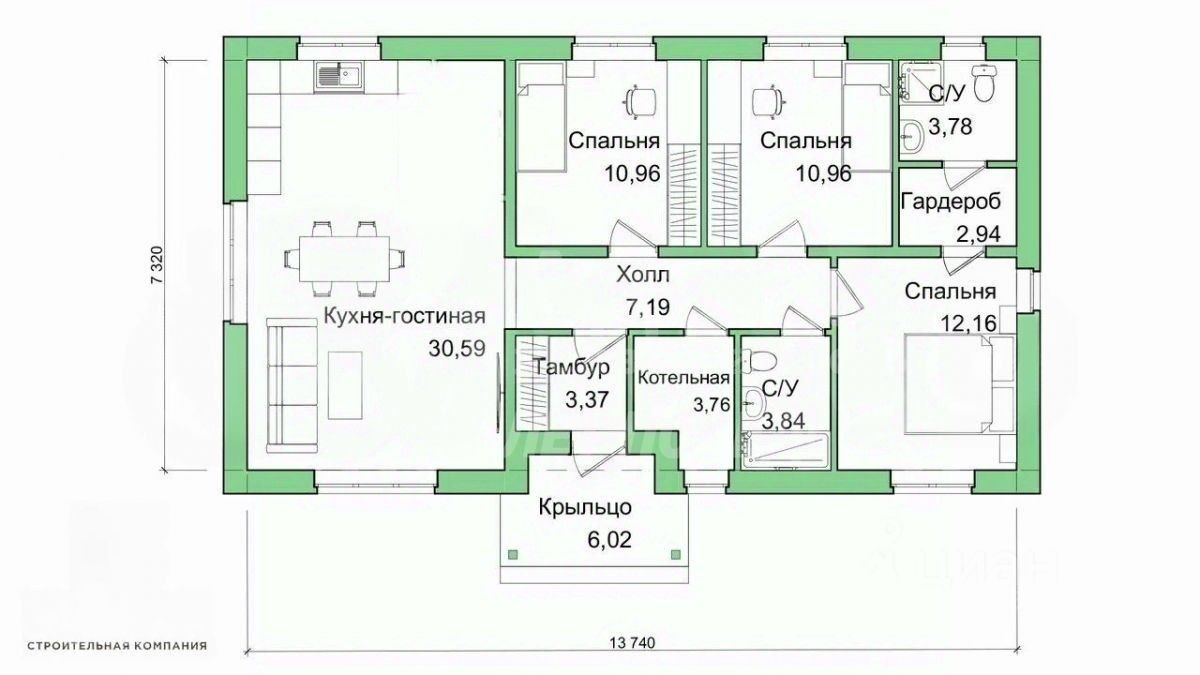 Войдя в дом, вы окажетесь в аккуратном тамбуре, который ведет в просторную кухню-гостиную настоящее сердце вашего будущего дома, идеальное место для семейных ужинов и теплых вечеров. В доме два санузла и три уютные, изолированные спальни.