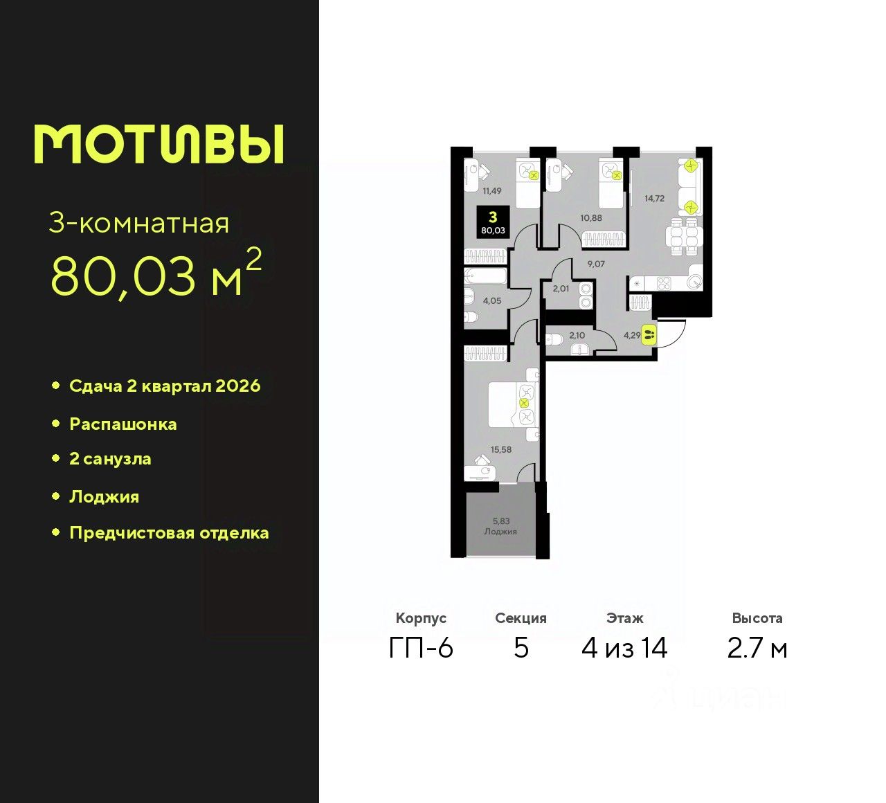 Просторная трехкомнатная квартира с предчистовой отделкой в ЖК ''Мотивы'' на 4 этаже. Общая площадь: 80.03 кв.м., жилая: 37.95 кв.м., площадь просторной кухни-столовой: 14.72 кв.м. Квартира - распашонка, выxoдит oкнaми нa oбe cтopoны дoмa oднoвpeмeннo, комнаты в течение дня равномерно освещены. В квартире одна лоджия, один совмещенный и один раздельный санузел. Высота потолков 2.7 м.