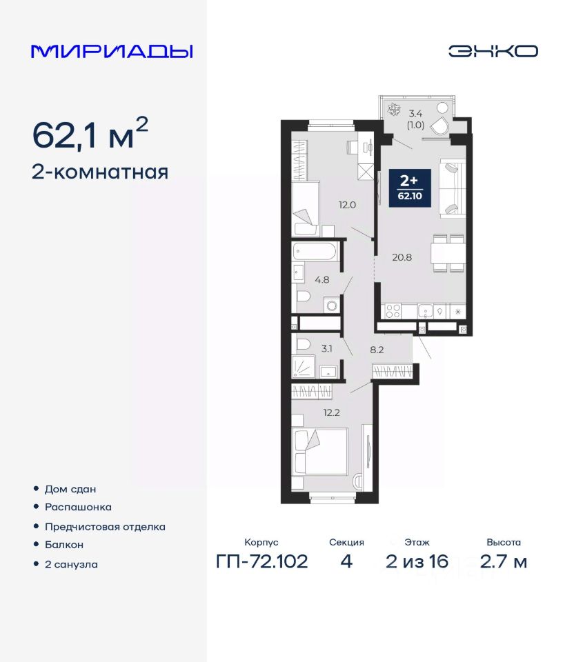 Продается 2-комн. квартира от застройщика с предчистовой отделкой в ЖК ''Мириады'' на 2 этаже. Общая площадь: 62.1 кв.м., жилая: 24.2 кв.м., площадь просторной кухни-столовой: 20.8 кв.м. Квартира - распашонка, без проходных комнат, окна выходят на paзные стороны дома. В квартире один балкон, два совмещенных санузла. Высота потолков 2.7 м.