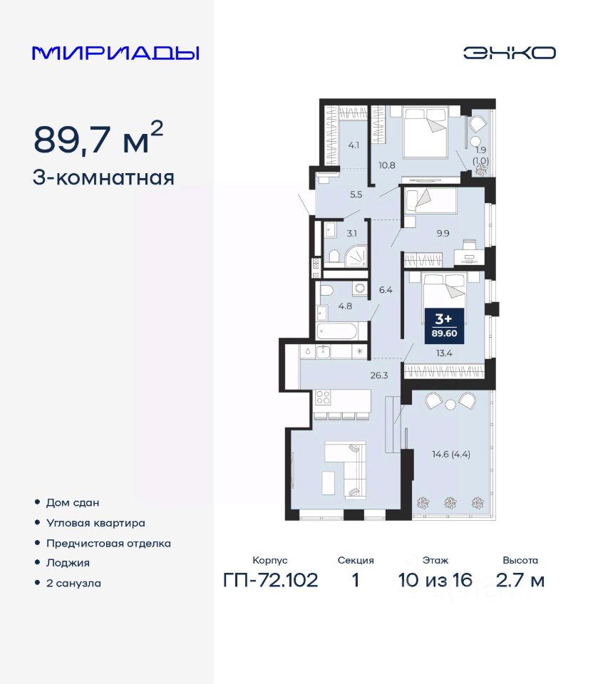 Трехкомнатная квартира от застройщика с предчистовой отделкой в ЖК ''Мириады'' на 10 этаже. Общая площадь: 89.7 кв.м., жилая: 34.1 кв.м., площадь просторной кухни-столовой: 26.3 кв.м. Квартира угловая, идеально подойдет любителям тишины и панорамных видов. В квартире две лоджии, два совмещенных санузла. Наличие террасы в квартире открывает возможность для создания зон отдыха в кругу семьи и друзей. Высота потолков 2.7 м.