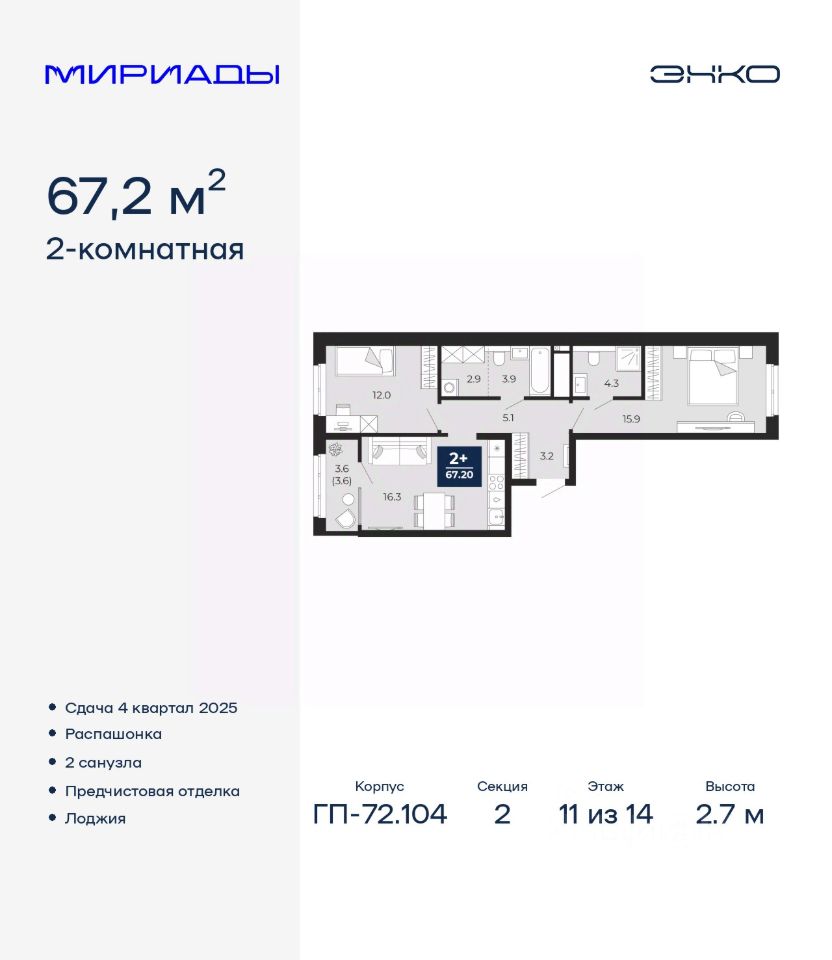 Просторная двухкомнатная квартира с предчистовой отделкой в ЖК ''Мириады'' на 11 этаже. Общая площадь: 67.2 кв.м., жилая: 27.9 кв.м., площадь просторной кухни-столовой: 16.3 кв.м. Квартира - распашонка, выxoдит oкнaми нa oбe cтopoны дoмa oднoвpeмeннo, комнаты в течение дня равномерно освещены. В квартире одна лоджия, два совмещенных санузла. Высота потолков 2.7 м.