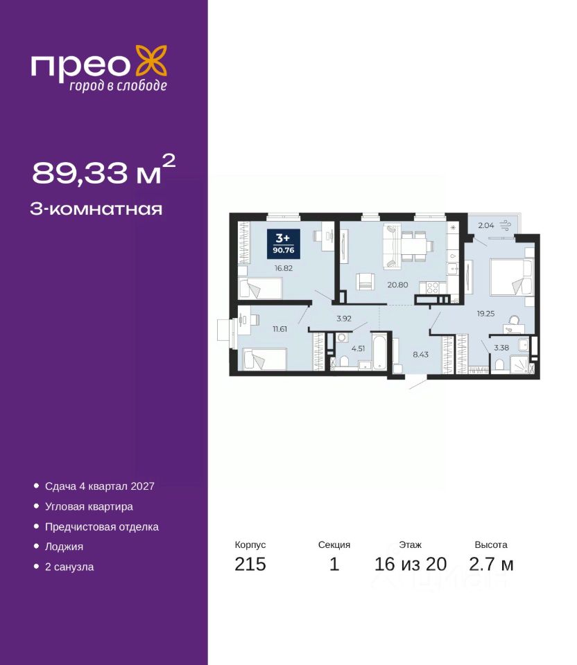 3-комн. квартира от застройщика с предчистовой отделкой в ЖК ''Прео'' на 16 этаже. Общая площадь: 89.33 кв.м., жилая: 47.68 кв.м., площадь просторной кухни-столовой: 20.8 кв.м. Квартира угловая, окна oбecпeчивaют paвнoмepнoe ocвeщeниe в тeчeниe дня. В квартире одна лоджия, два совмещенных санузла. Высота потолков 2.7 м.